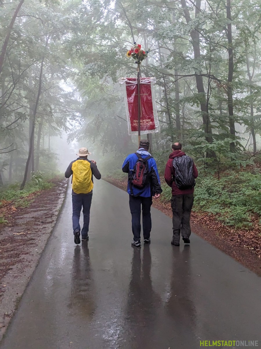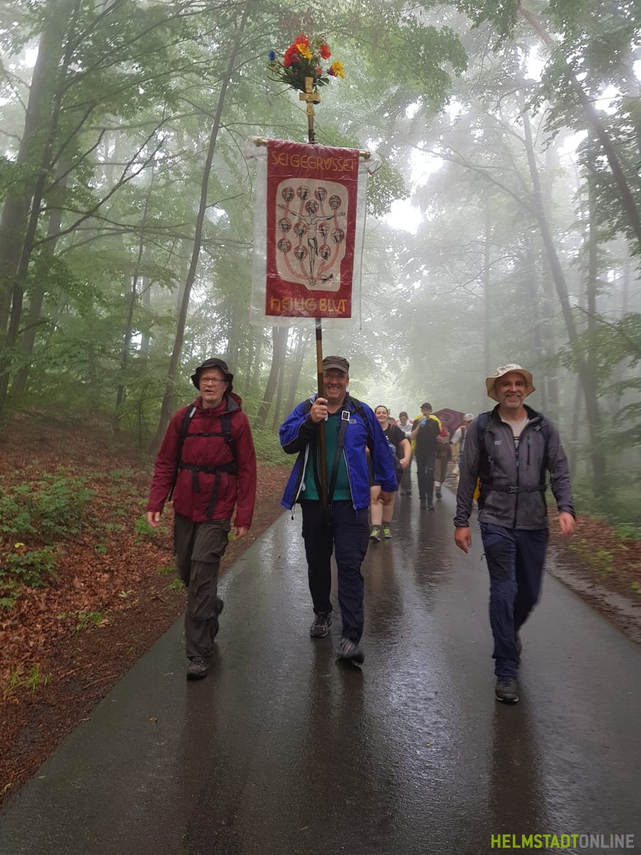 Um 13:00 Uhr wurde unsere Pilgergruppe  verabschiedet und wir traten den etwa 15 km langen Heimweg, der von einem heftigen Regenguss begleitet wurde, nach Helmstadt an. Am Anger wurden wir von Pfarrer Grönert und einigen Ministranten um 18:00 Uhr erwartet, zur Kirche geleitet und erhielten den Abschlusssegen der diesjährigen Wallfahrt.