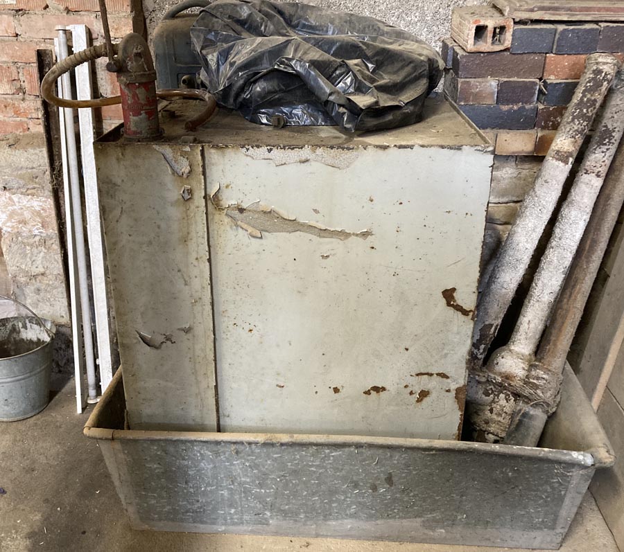 Alter, aber dichter Metall-Kraftstofftank (geschätztes Fassungsvermögen 400L) mit funktionierender Pumpe und Metallwanne gegen Selbstabholung zu verschenken