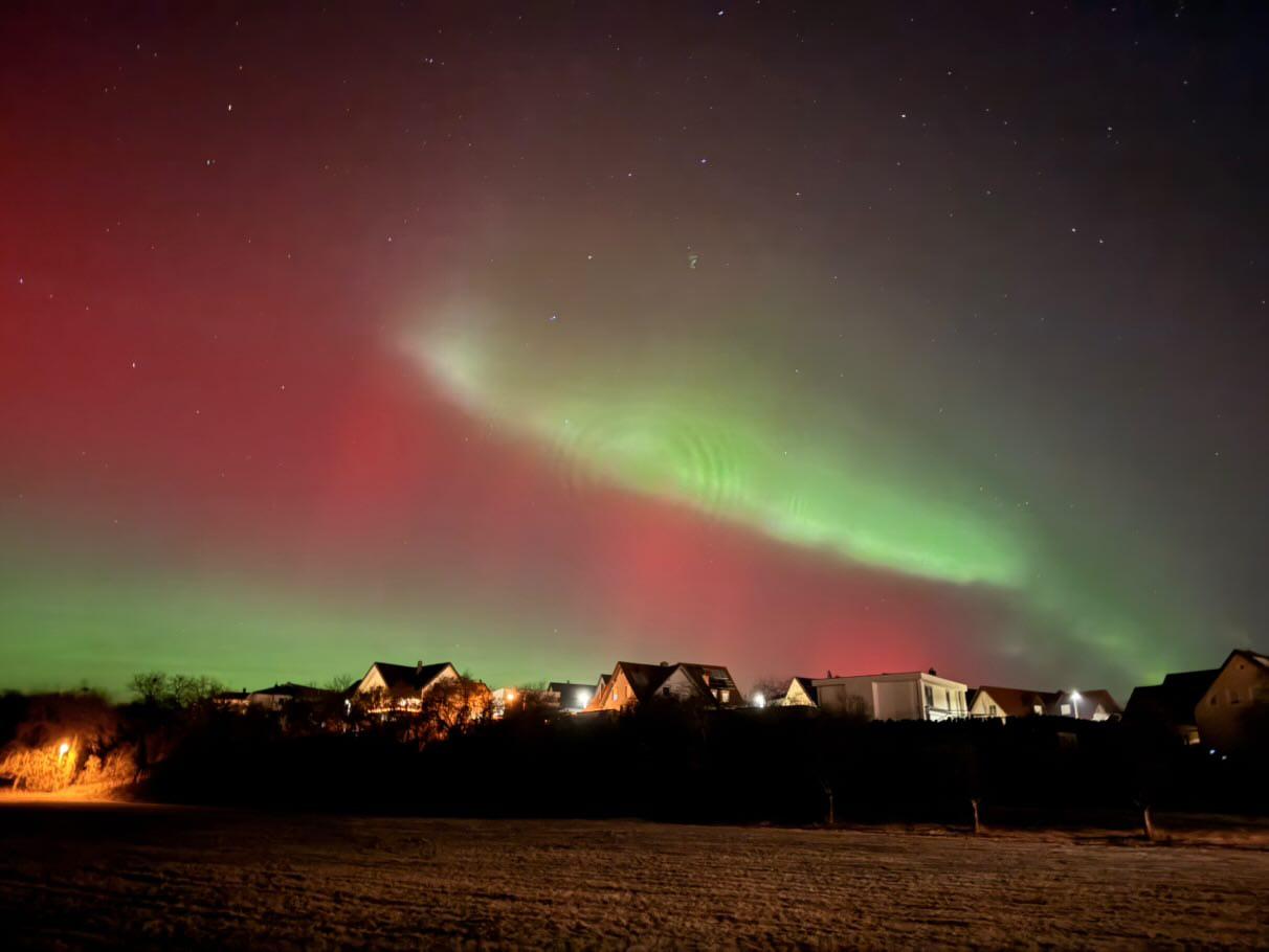 Am Abend des 19. Januar 2026 konnte man über Helmstadt ein beeindruckendes Naturschauspiel beobachten. Diese sogenannten Polarlichter sind farbige Lichter am Nachthimmel, die sich häufig wie Schleier oder Wellen bewegen. Sie entstehen, wenn Teilchen von der Sonne auf die Erdatmosphäre treffen. Dabei beginnen Gase in der Luft zu leuchten und erzeugen meist rote und grüne Farben.