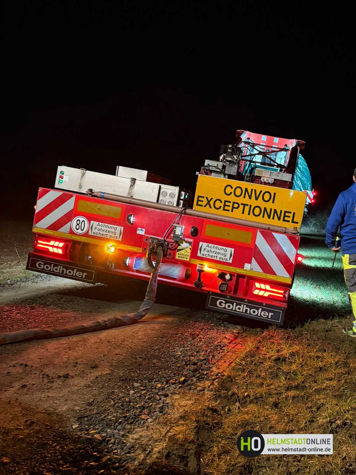 Das Gesamtgewicht beläuft sich auf rund 120 Tonnen und konnte aufgrund der Bodenverhältnisse nicht weiter bewegt werden. Trotz sorgfältiger Planung und Vorbereitung führten die aktuellen Bedingungen dazu, dass das Spezialfahrzeug die Zufahrt nicht vollständig passieren konnte. Zusätzlich stehen zwei weitere Schwerlasttransporte mit Anlagenteilen in der Warteschlange und können ihre Fahrt zum Montageplatz nicht fortsetzen. Aktuell wird geprüft, ob kurzfristig ein Kranstellplatz errichtet werden kann. Ein solcher Kranplatz würde es ermöglichen, das Bauteil mithilfe eines Mobilkrans zu entladen oder umzusetzen, um den Transport fortzuführen.