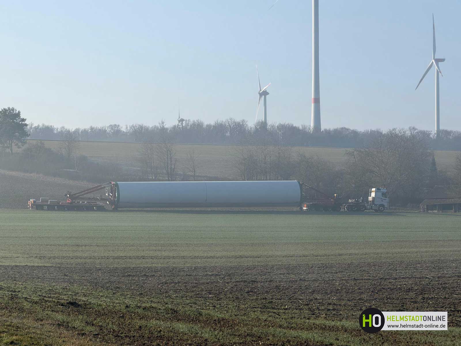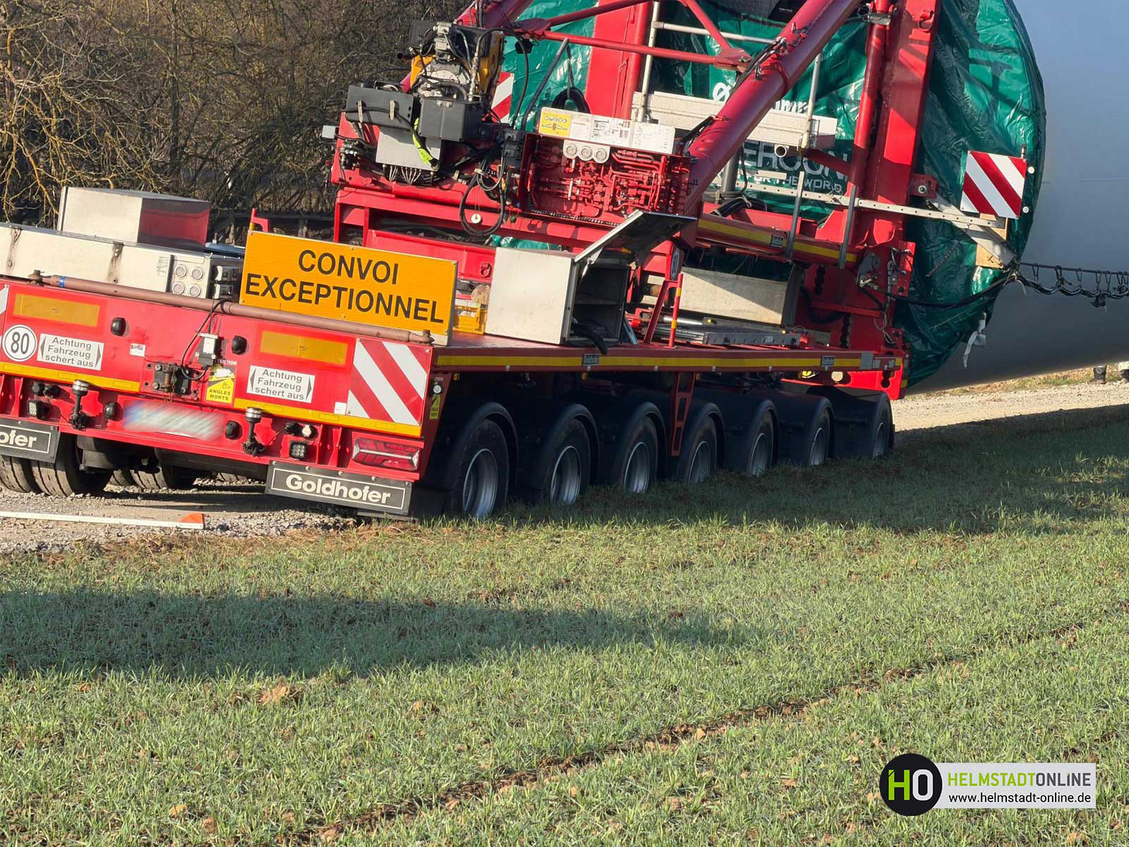 Ein Schwerlasttransport mit einem Bauteil für eine Windenergieanlage ist auf dem Weg zum Montageplatz im aufgeweichten Untergrund steckengeblieben.