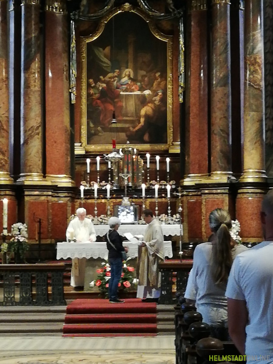 Am Sonntag früh um 6:30 Uhr war die Pilgermesse für Helmstadt. Hier nahmen auch Helmstadter teil, die in aller Frühe aus Helmstadt gekommen sind. In diesem Rahmen wurden Volker Ditterich für 25 Jahre und Brigitte Menig für 40 Jahre für ihre langjährige Teilnahme geehrt.