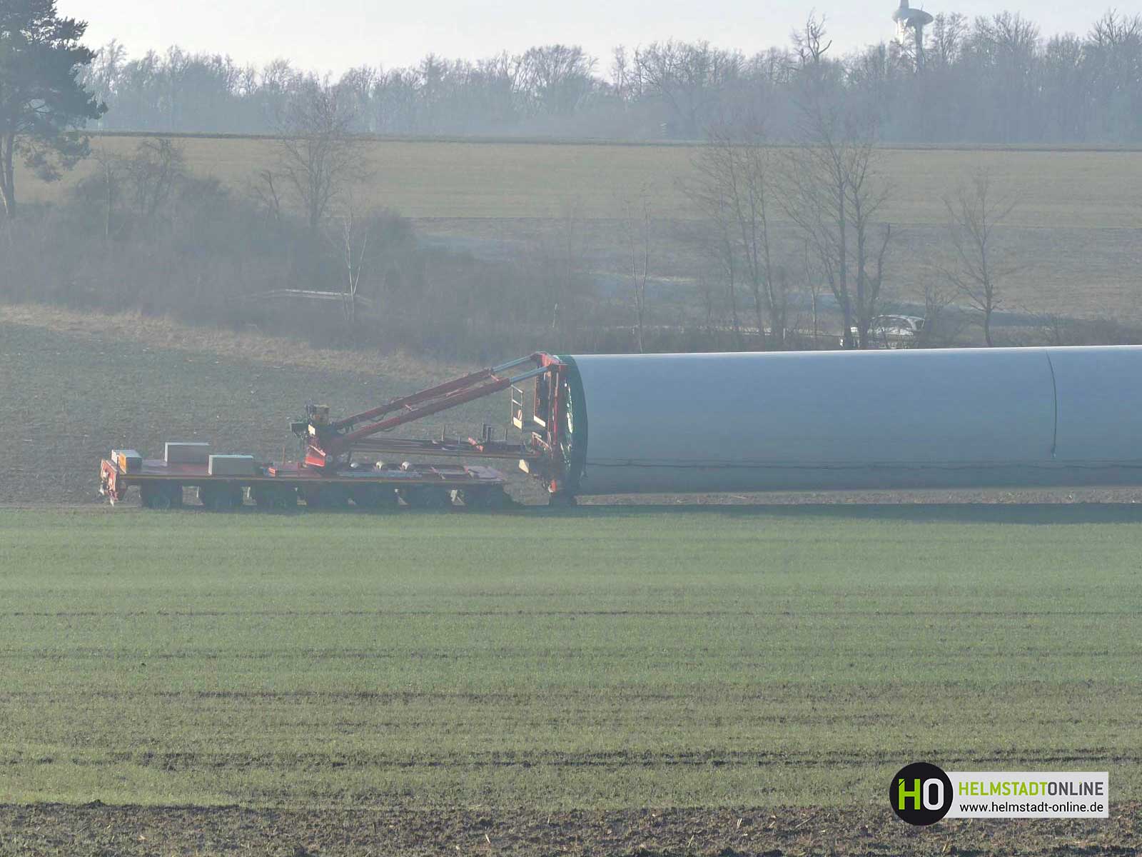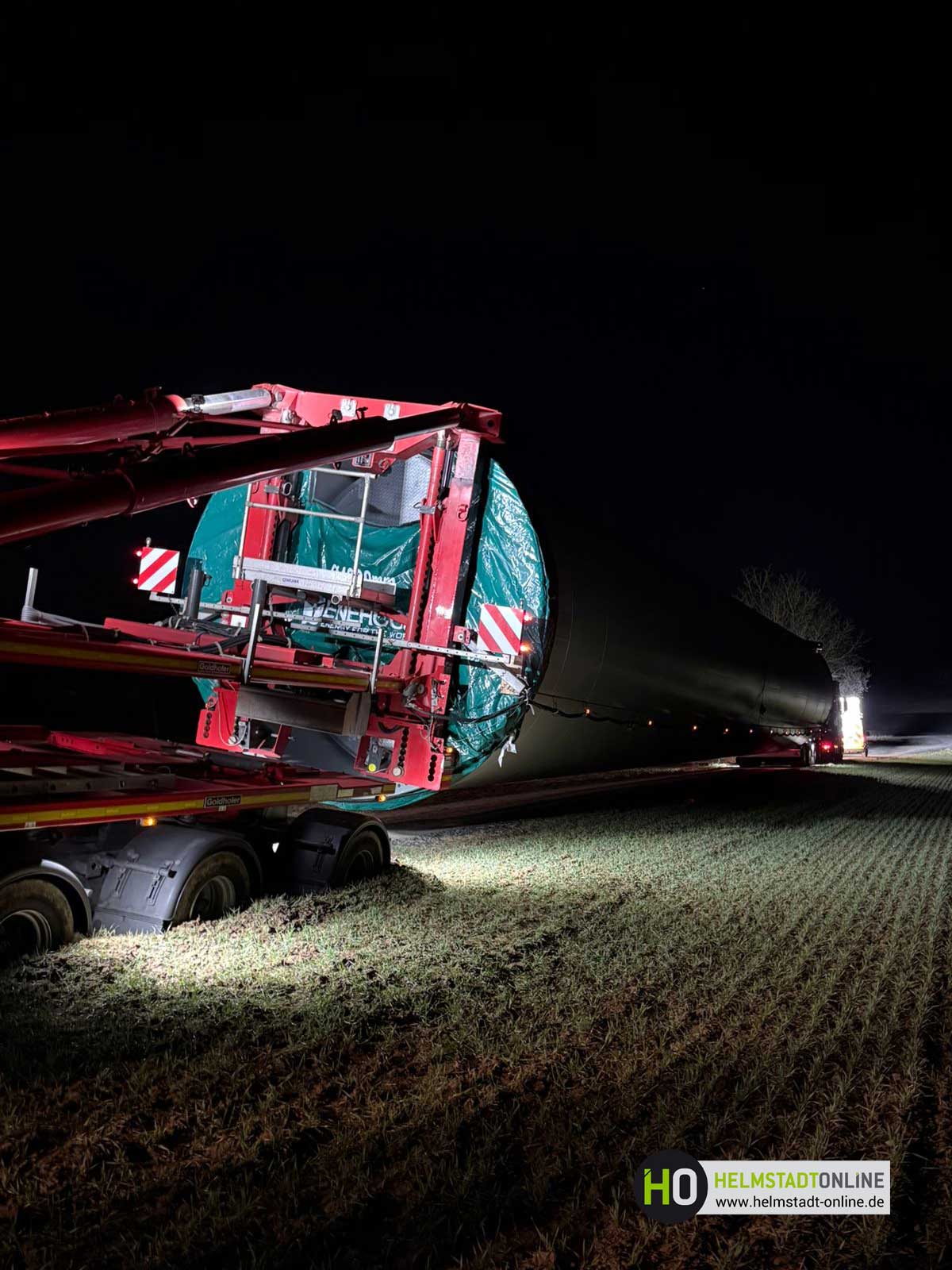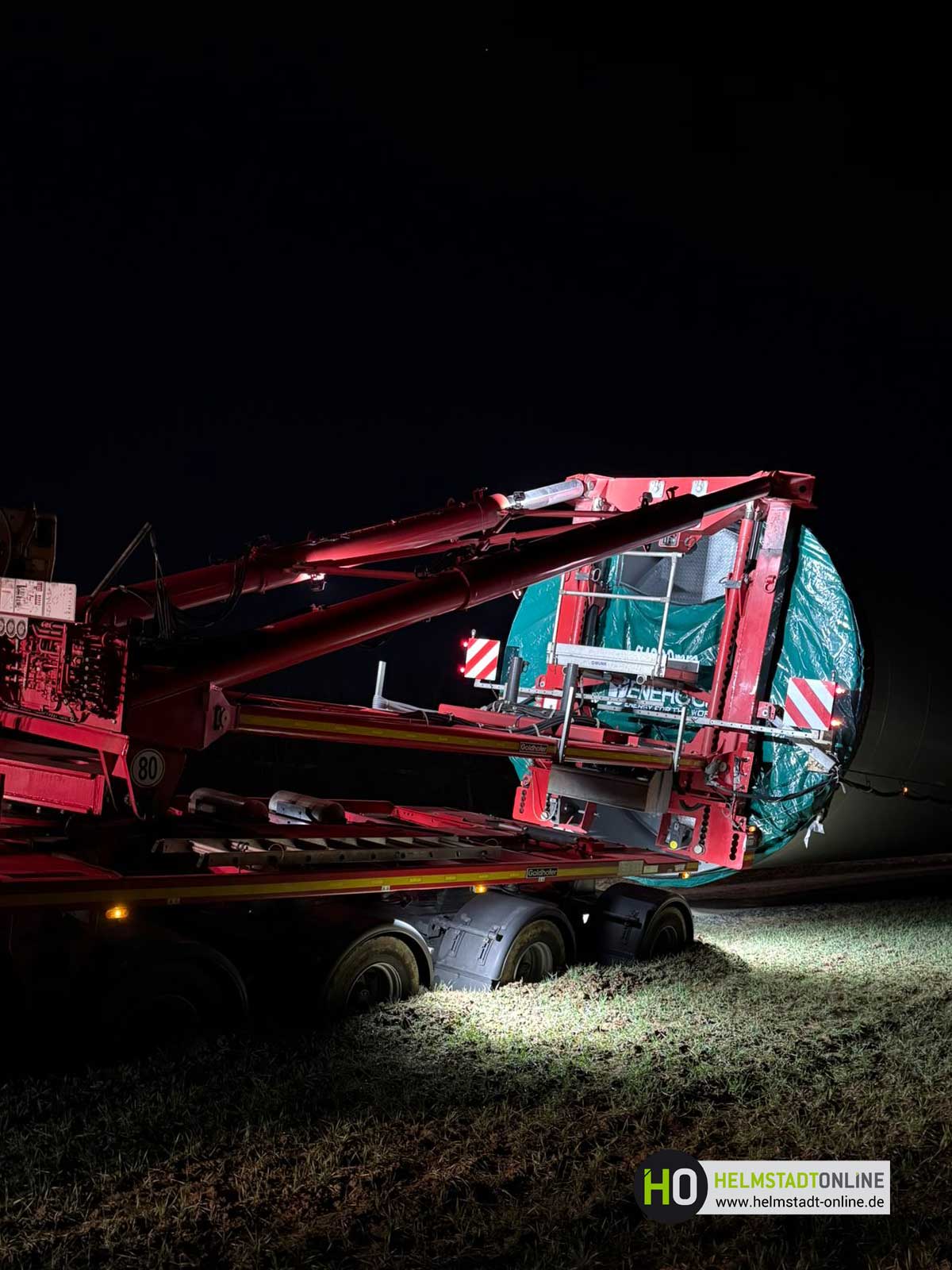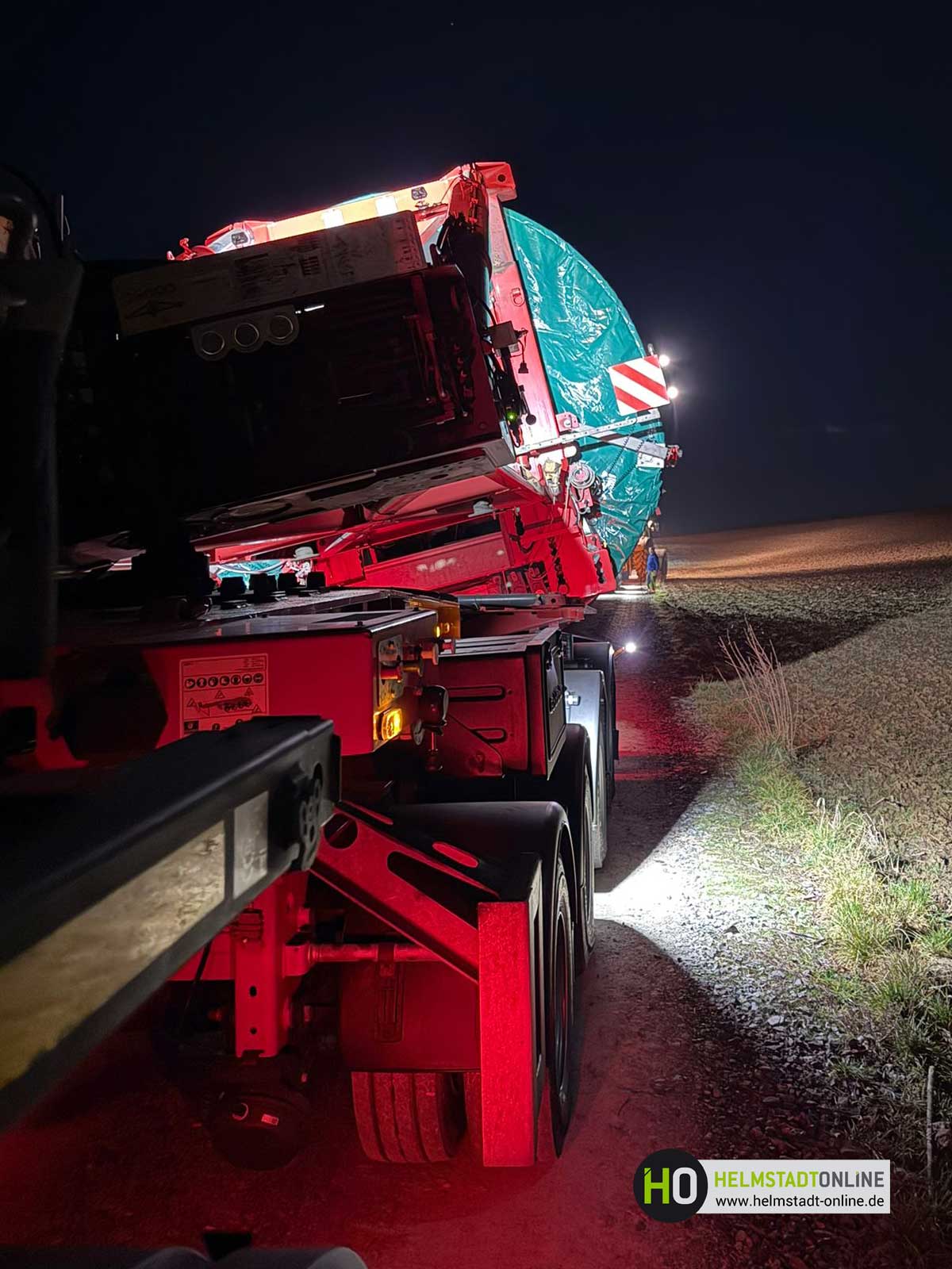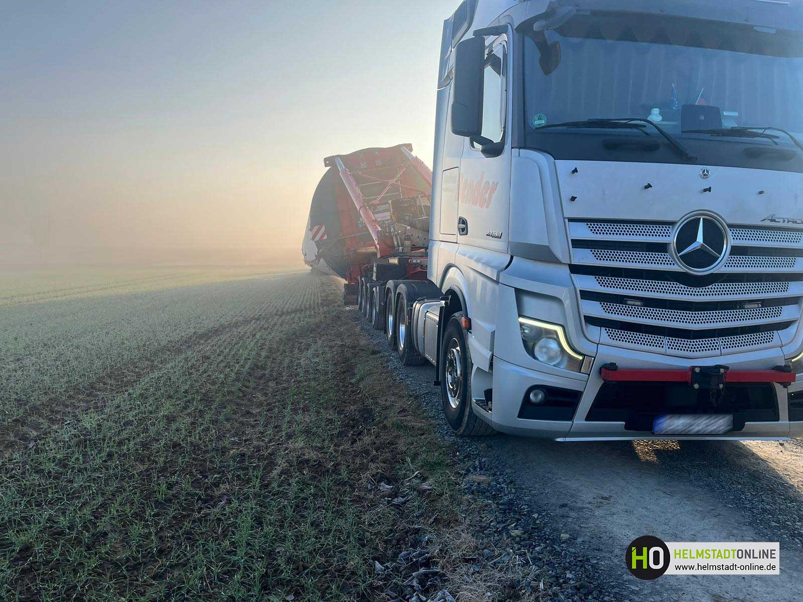 Ein Schwerlasttransport mit einem Bauteil für eine Windenergieanlage ist auf dem Weg zum Montageplatz im aufgeweichten Untergrund steckengeblieben.