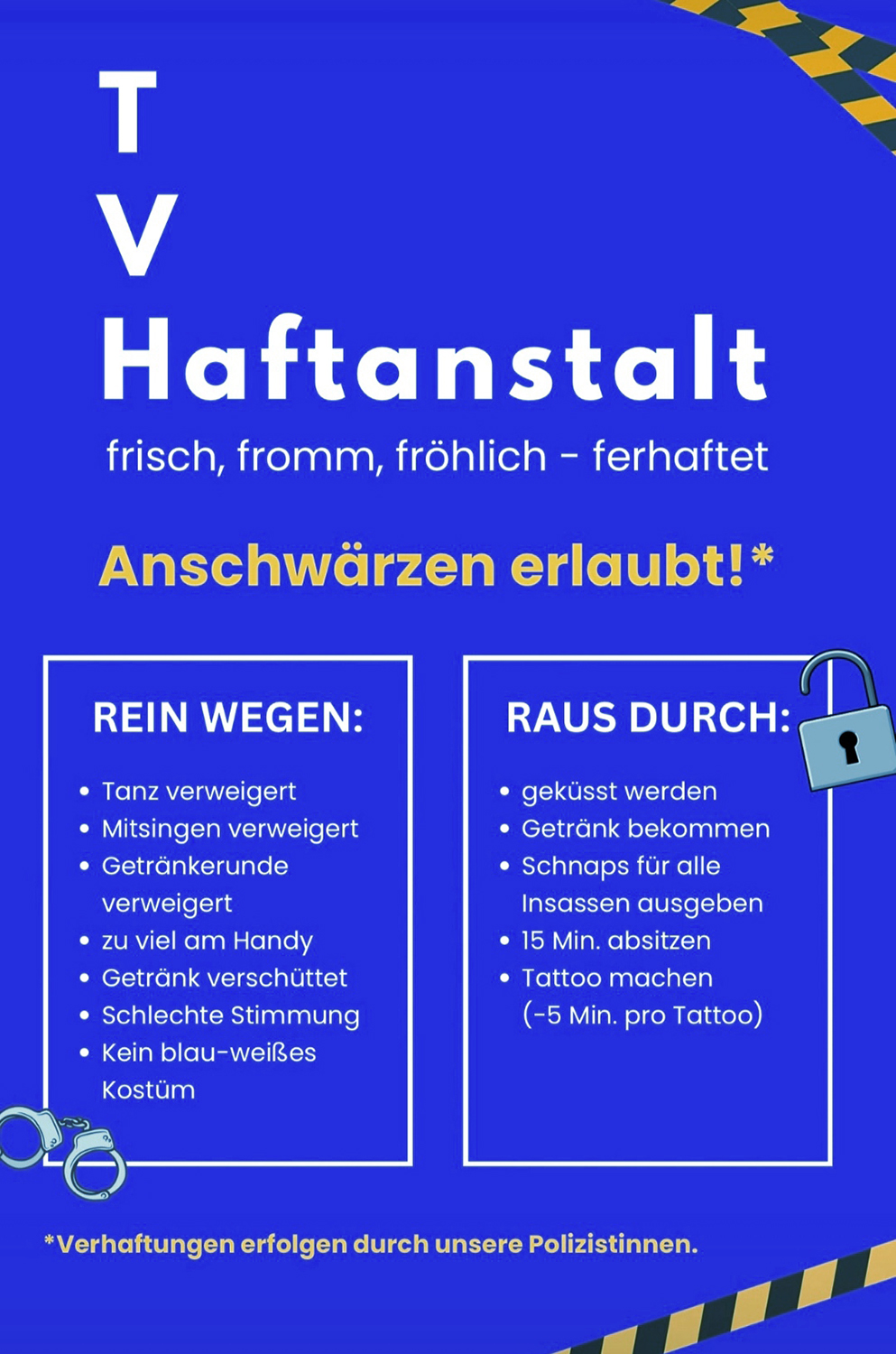 Am Samstag öffnete der TV Helmstadt die Türen zu seinem farbenfrohen Blau-Weiß-Kostümball. Zur Musik von René Bauer wurde viel getanzt und gefeiert. Die TV-Haftanstalt kam richtig gut an – vielleicht sogar ein bisschen zu gut, denn das „Gefängnis“ war zeitweise ziemlich voll. Mitternacht brachte ein echtes Highlight: