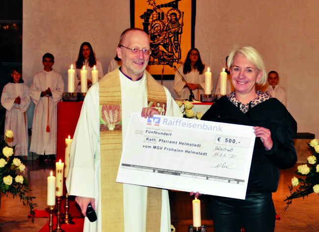 Am Ende des Vorabendgottesdienstes am Samstag, den 11.01.2020 übergab voller Stolz Lena Becker, die Präsidentin des MGV Frohsinn Helmstadt, einen Scheck in Höhe von 500 € an Pfarrer Berthold Grönert als Beitrag zur Deckung der Heizkosten unserer St. Martin Kirche. Dieser Betrag ist die Hälfte des Spendenerlöses von den Besuchern des Vorweihnachtlichen Konzerts am 3. Adventssonntag letzten Jahres in der Pfarrkirche.