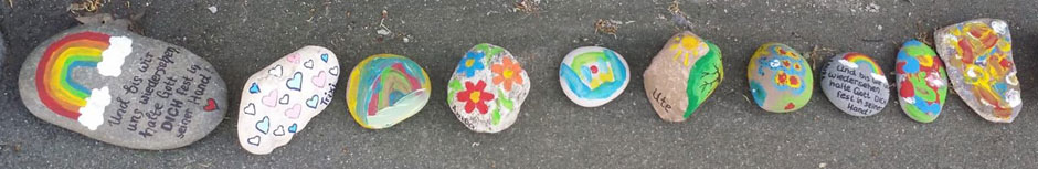 um die Corona-Zeit fröhlicher zu gestalten, malt doch zu Hause einen STEIN an (funktioniert z. B. mit Acrylfarbe, Serviettentechnik, Edding – der Umwelt zu liebe ohne Plastikaugen etc.) und legt ihn zu unserer Steinschlange!