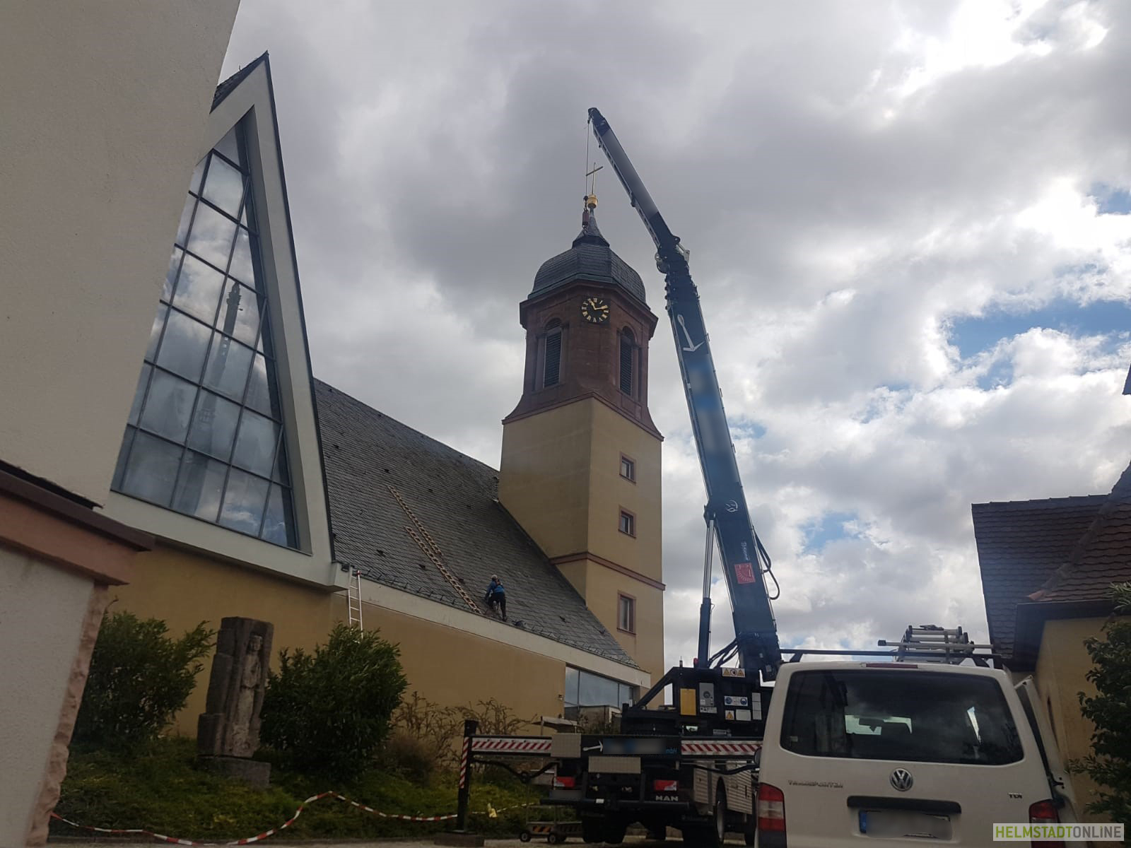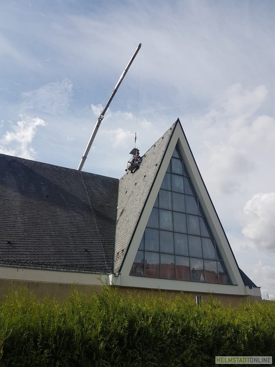 Reparaturarbeiten am Kirchendach Details News 31. August 2020 Längst wurde der Kircheneingang durch Gefahr herabfallender Schieferplatten gesperrt. Jetzt wurden die Reparaturarbeiten mit Hilfe eines Krans ausgeführt und der Eingang ist wieder begehbar. Bilder: Bernd, Berthold Grönert | © HelmstadtOnline