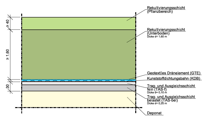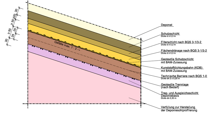 Die geplante Deponie wird entsprechend der gesetzlichen Vorgaben eine Abdichtung gegenüber dem Untergrund, also eine Basisabdichtung und am Ende der Einlagerung eine Oberflächenabdichtung erhalten.