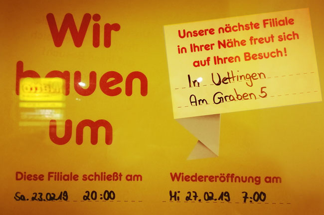 Wie ihr vielleicht schon bemerkt habt, sind die Mitarbeiter fleißig dabei den Netto Markt auszuräumen. Grund hierfür ist ein Komplettumbau. Deshalb ist es notwendig, dass der Markt für eine kurze Zeit schließt. Ab Samstag, 23.02.19 um 20:00 Uhr ist der Markt geschlossen. Wiedereröffnung ist am Mittwoch, 27.02.19 um 07:00 Uhr.