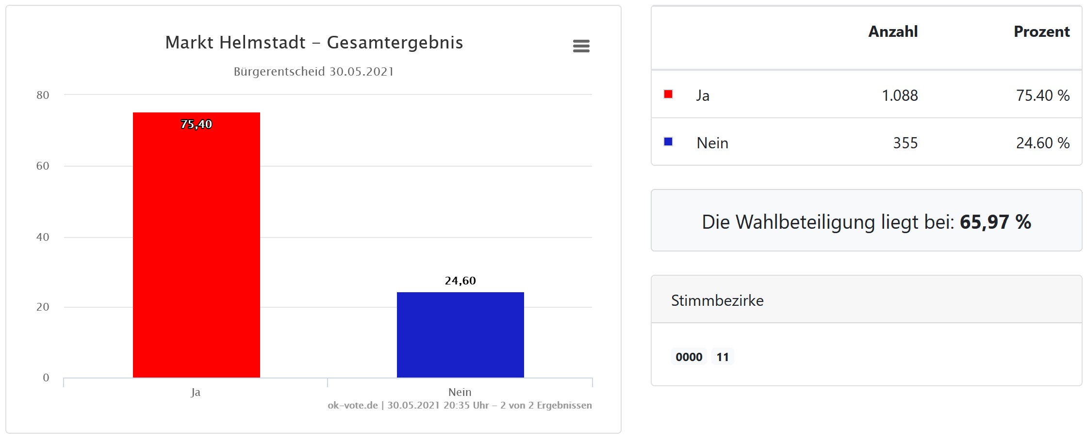 Mit 75,4 Prozent stimmte die Bevölkerung mit JA. Nun ist die Gemeinde Helmstadt in der Pflicht, alle zulässigen rechtlichen Möglichkeiten auszuschöpfen, um die geplante DK1-Deponie zu verhindern.