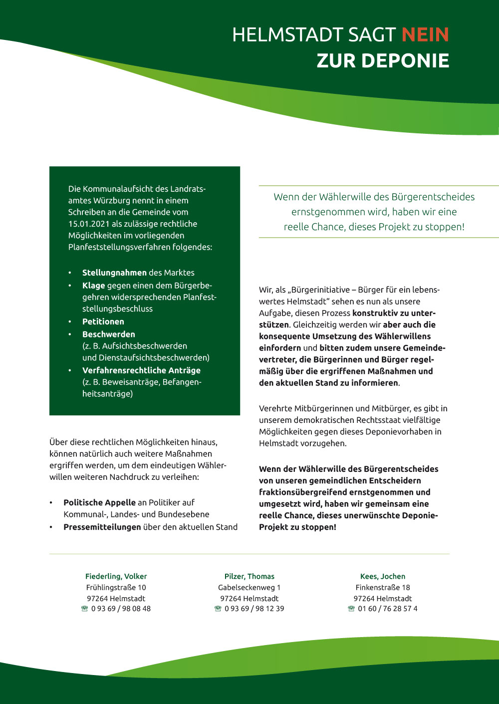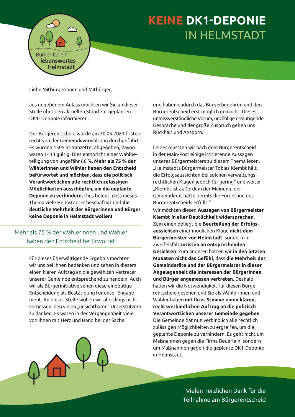 Infoflyer der Bürgerinitiative zur DK1-Deponie Details News 02. Juli 2021 Die Bürgerinitiative "Bürger für ein lebenswertes Helmstadt" hat einen weiteren Flyer herausgebracht. Anklicken und lesen: