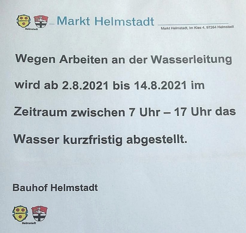 In der KW 31/32 finden wieder Arbeiten an der Wasserleitung statt, es werden defekte Schieber getauscht hierzu muss das Wasser kurzfristig abgestellt werden. Die Baumaßnahmen betrifft Helmstadt und Holzkirchhausen.