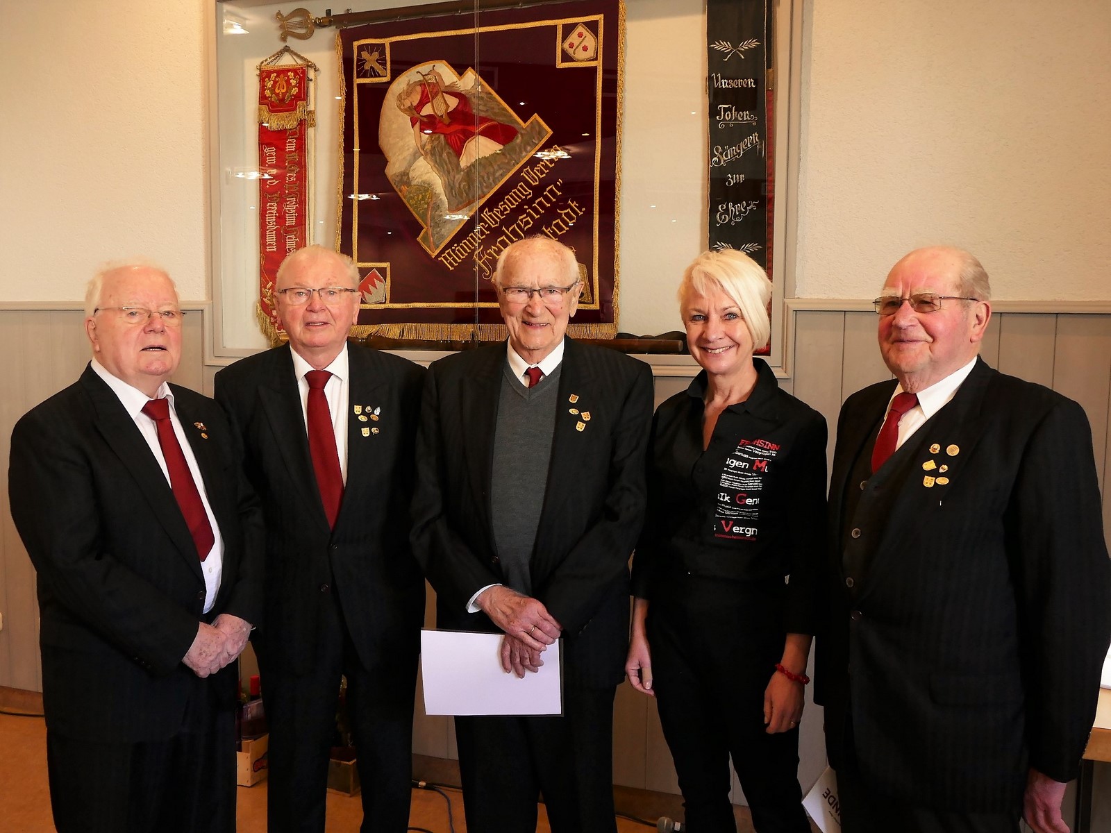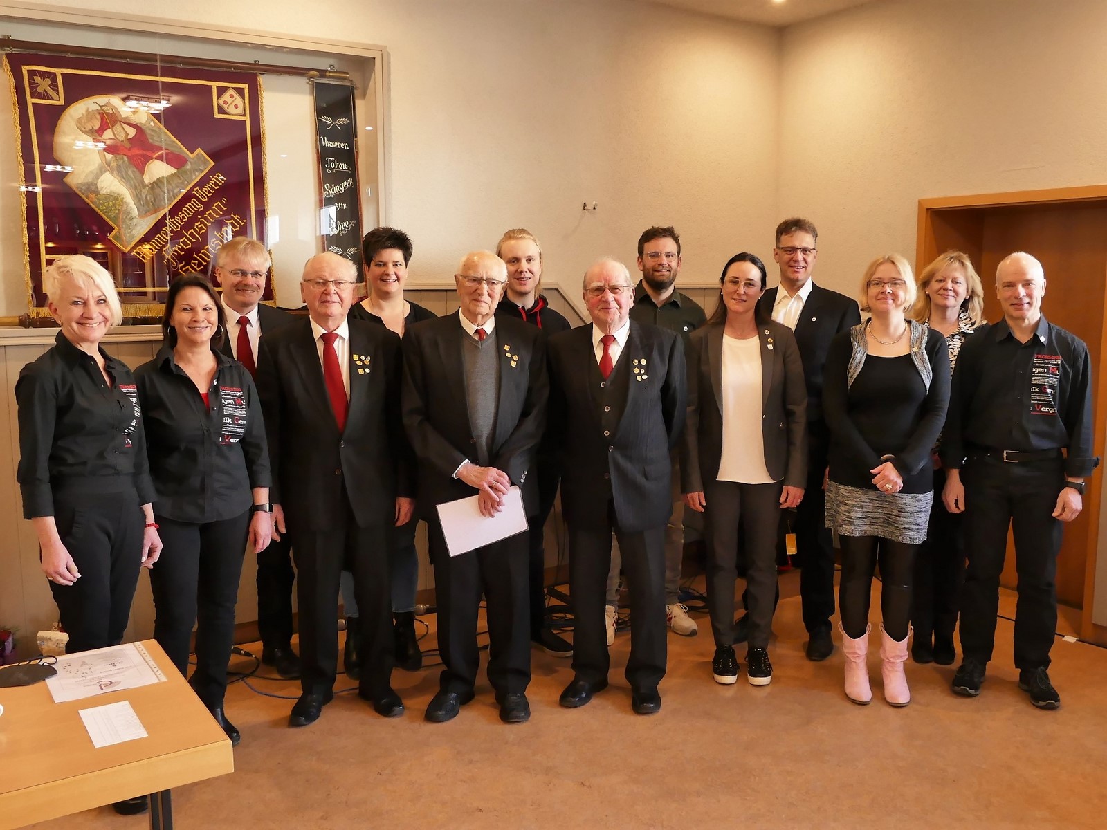Besonders hob sie nun für ganz besonders langjährigen Chorgesang Willi Martin für 65 Jahre, Burkard Gersitz für 70 Jahre und Werner Gersitz für die sehr seltene Ehrung für 75 Jahre hervor. Lena Becker betonte, dass gerade sie sich mit ihrem Verein sehr verbunden fühlen, sich engagieren und trotz mancher Widrigkeiten des Lebens stets frohsinnig zu den Chorproben kommen. Werner Gersitz, 91 Jahre blickte in ein paar launigen Worten dabei zurück auf viele Frohsinn-Jahre und hob dabei besonders den Bau des Hauses Frohsinn hervor. Es war eine großartige Gemeinschaftsleistung und ist das Fundament des Vereins bis heute und sicherlich noch für viele weitere Jahre.