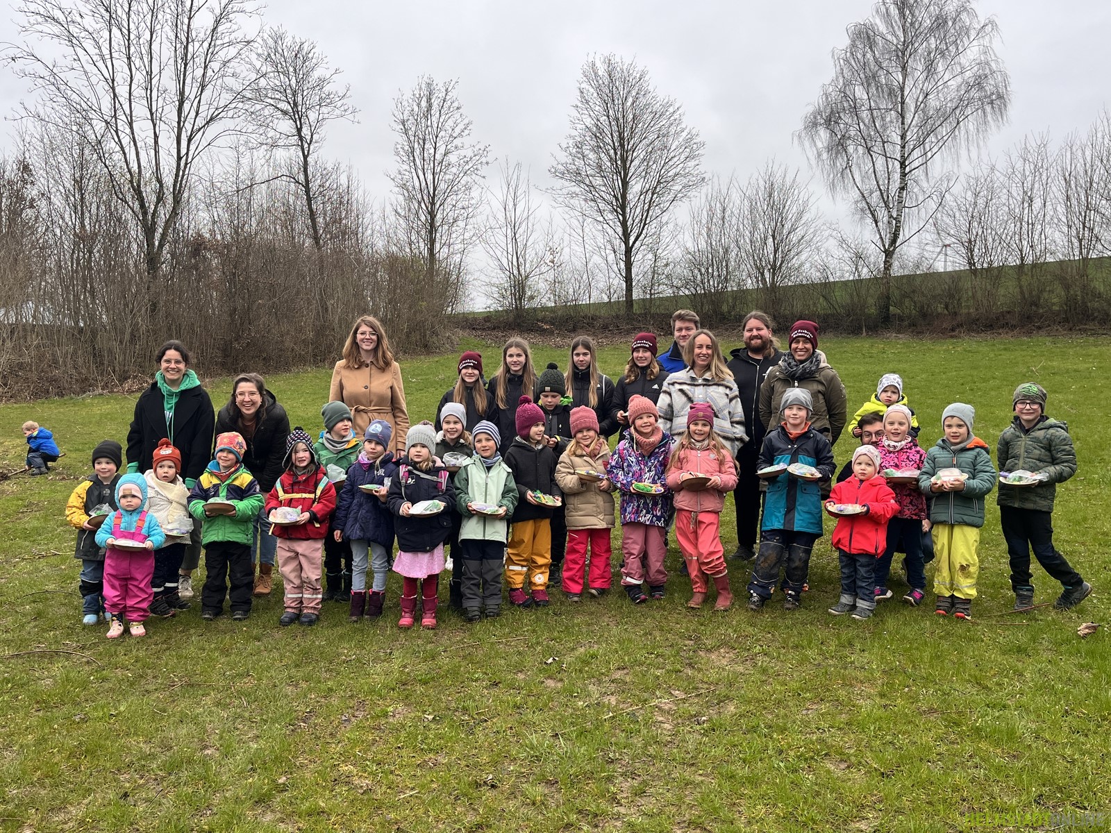 Gemeinsam ging es im Anschluss zum Grillplatz, wo der Osterhase schon fleißig für jeden ein wasserdicht verpacktes Osternest versteckt hatte. Nach tagelangem Bangen, ob der Regen der Suche einen Strich durch die Rechnung machen würde, war es zwar stellenweise matschig, aber zumindest nicht mehr regnerisch, sodass alle gemeinsam die Nester suchen konnten. Das ein oder andere Nest war dabei so gut versteckt, dass die Helfer des Osterhasen den Suchenden etwas unter die Arme greifen mussten.