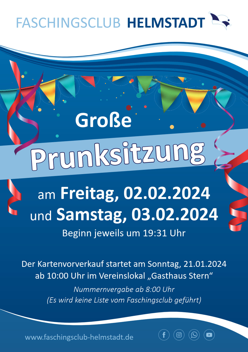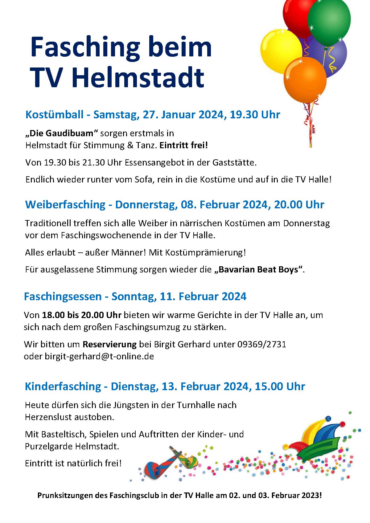 Fasching in Helmstadt Details News 17. Januar 2024 Helmstadt feiert Fasching. Hier haben wir einige Termine rund um den Fasching bei uns im Ort. Alle Termine ansehen