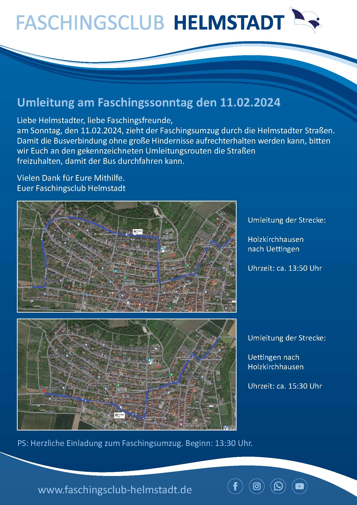 Am Sonntag, den 11.02.2024, zieht der Faschingsumzug durch die Helmstadter Straßen. Damit die Busverbindung ohne große Hindernisse aufrechterhalten werden kann, bitten wir Euch an den gekennzeichneten Umleitungsrouten die Straßen freizuhalten, damit der Bus durchfahren kann. Vielen Dank für Eure Mithilfe.