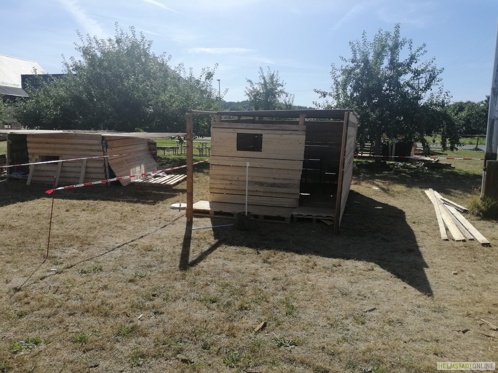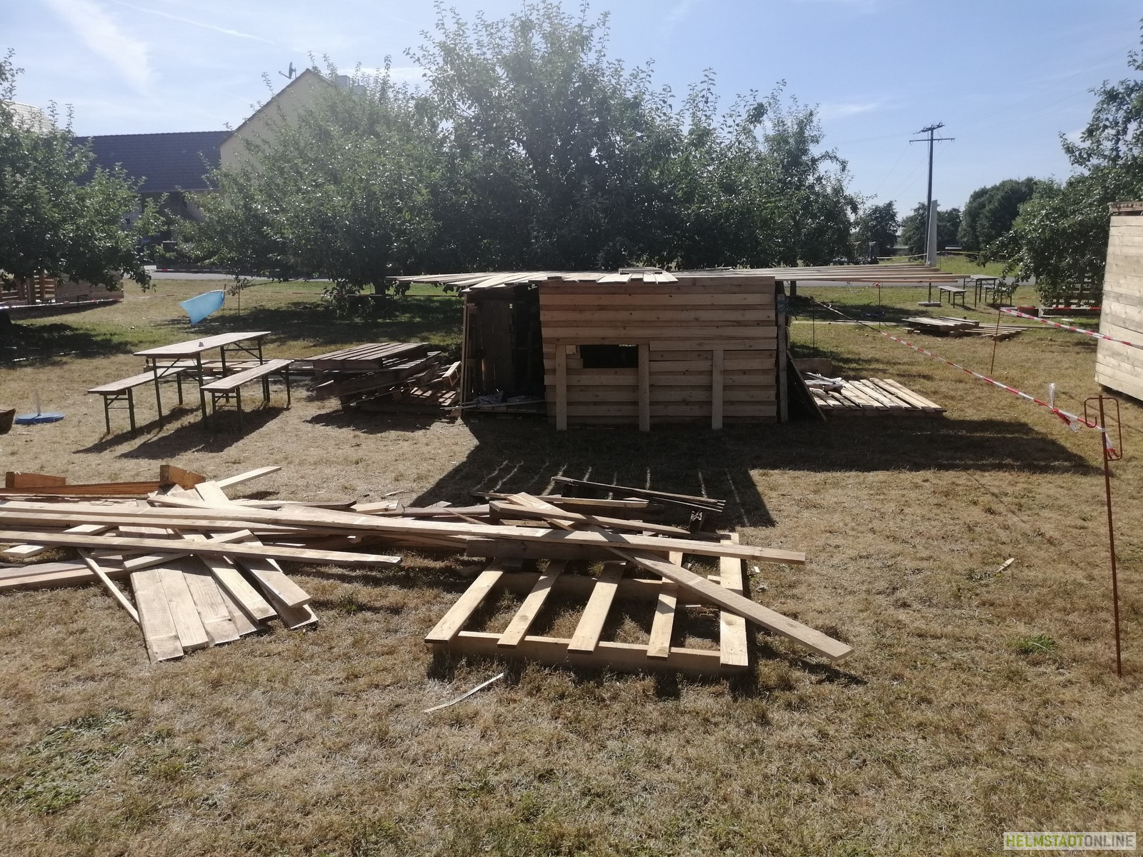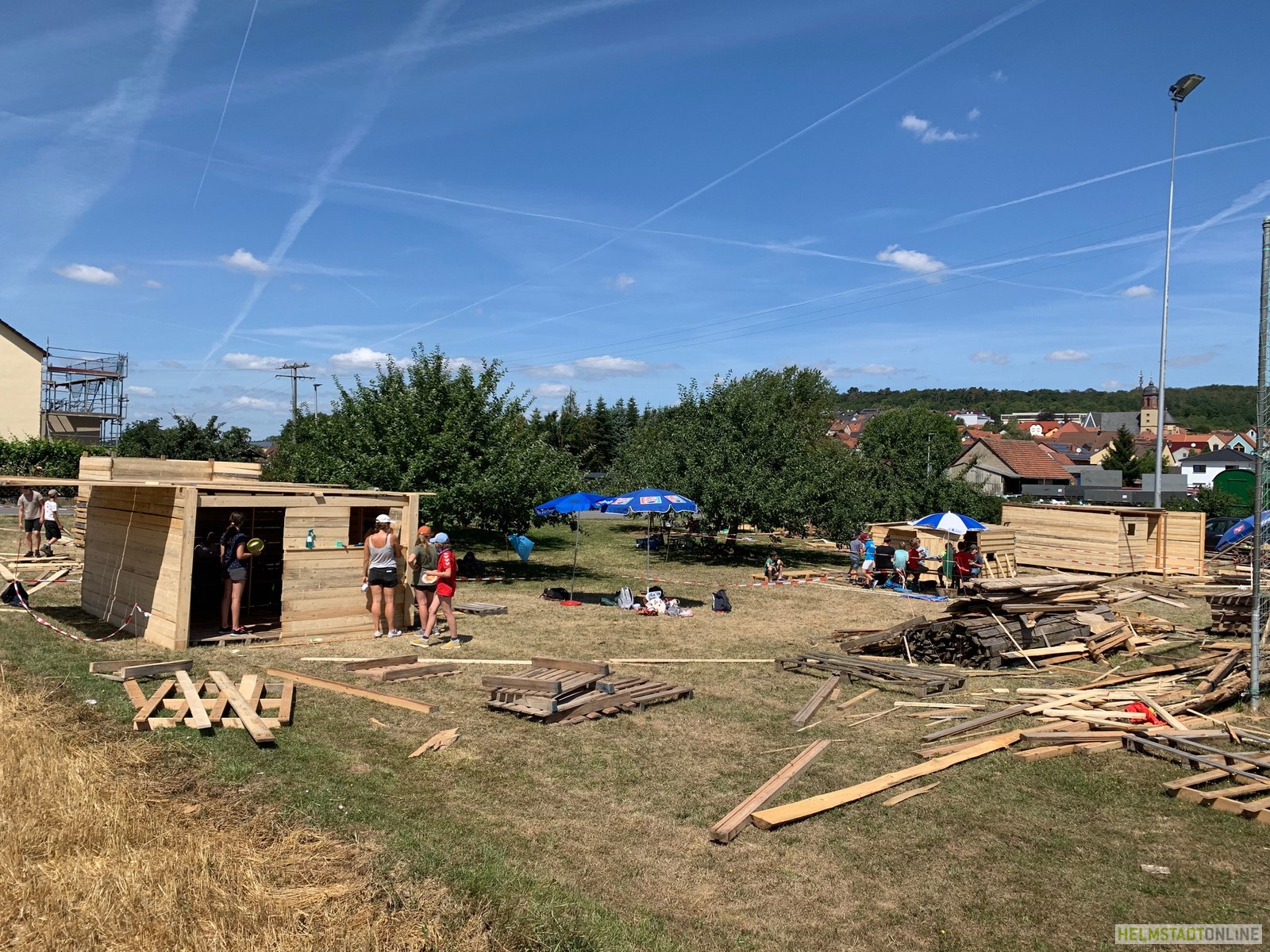 Der Bau des Hüttendorfes am FC Sportplatz hat begonnen. Zahlreiche Kinder bauen an ihren Hütten.