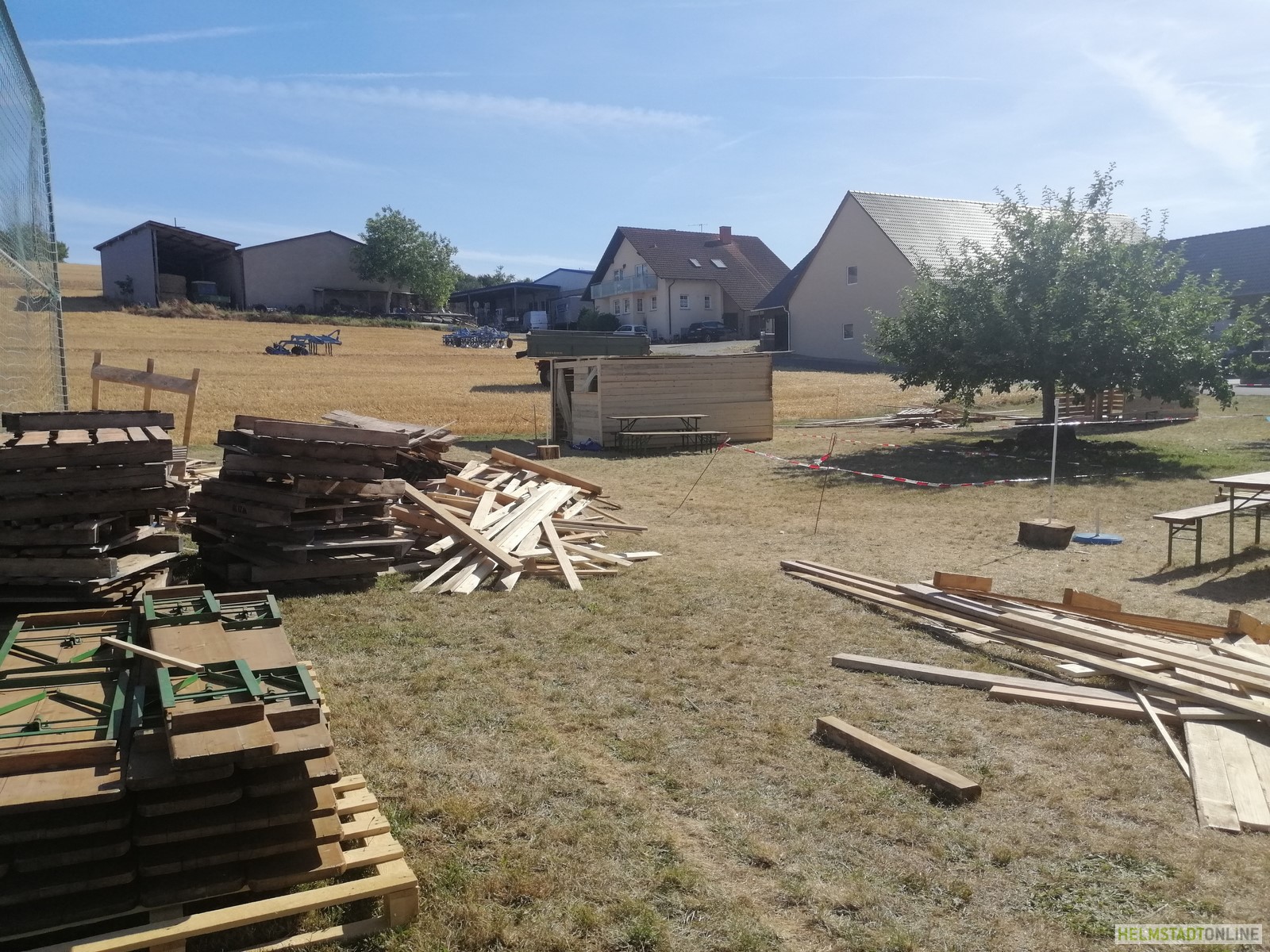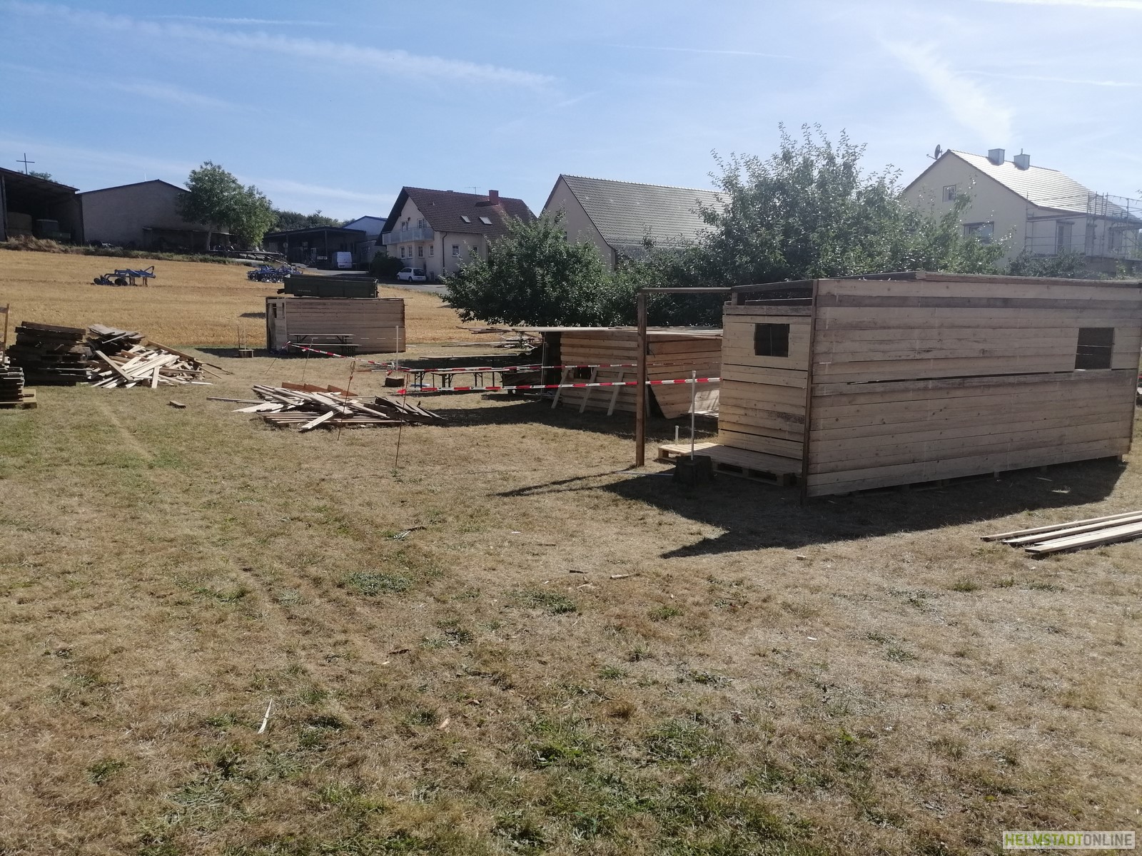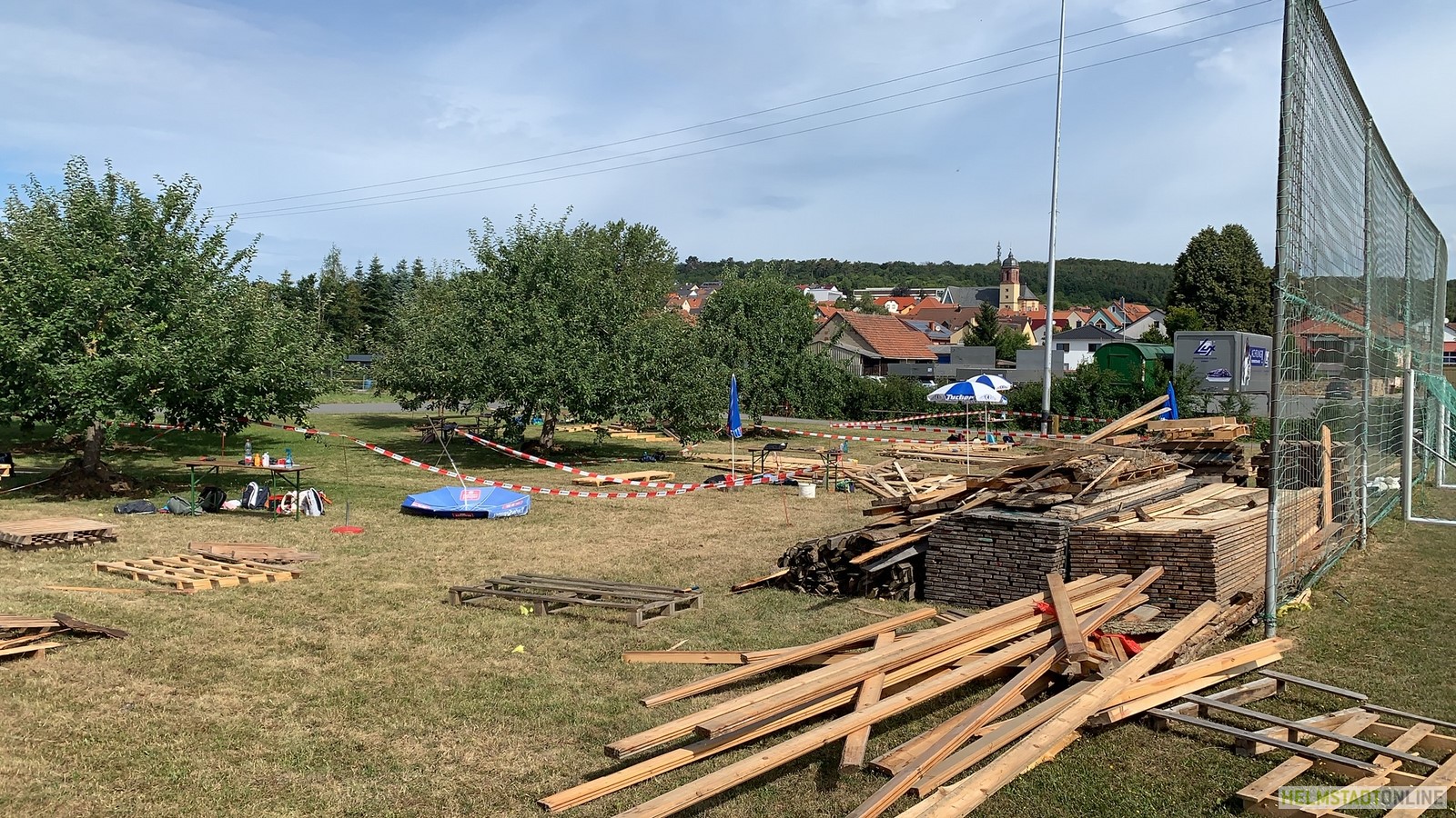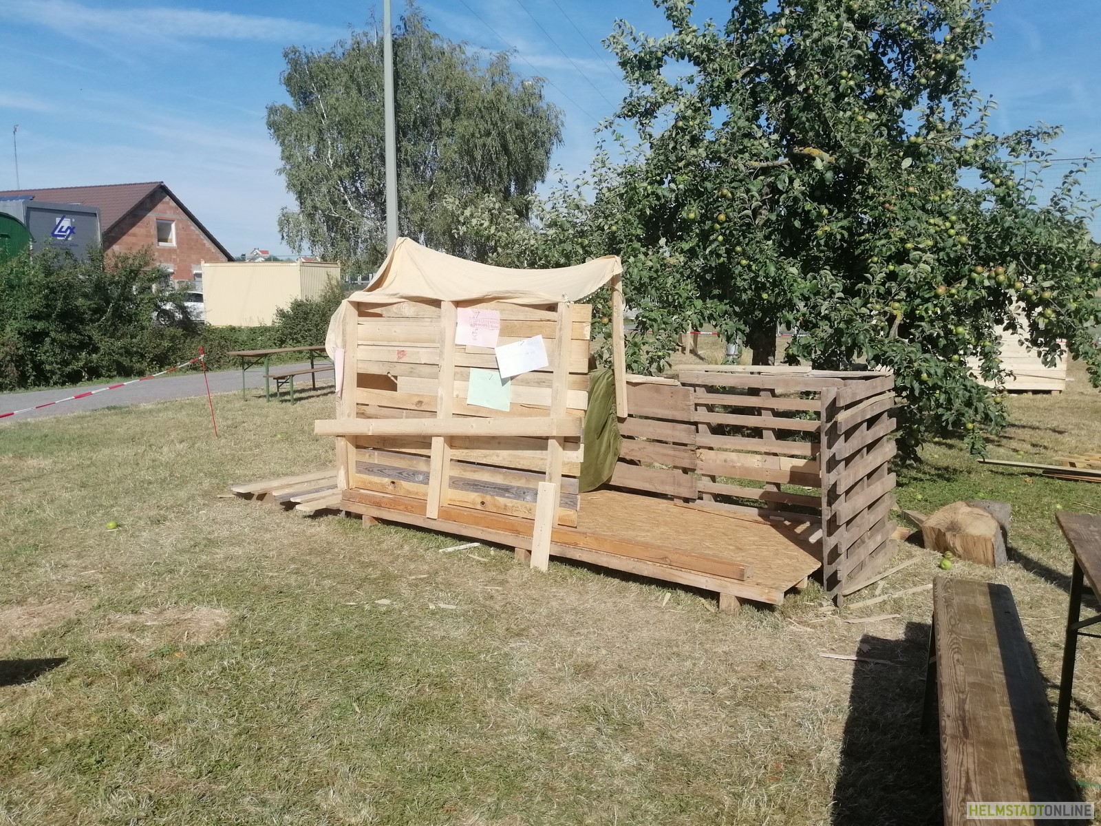 Der Bau des Hüttendorfes am FC Sportplatz hat begonnen. Zahlreiche Kinder bauen an ihren Hütten.