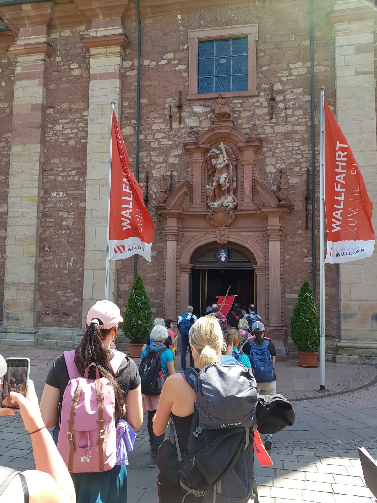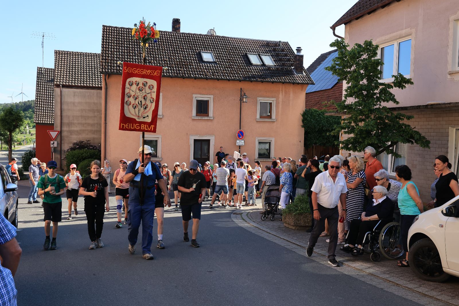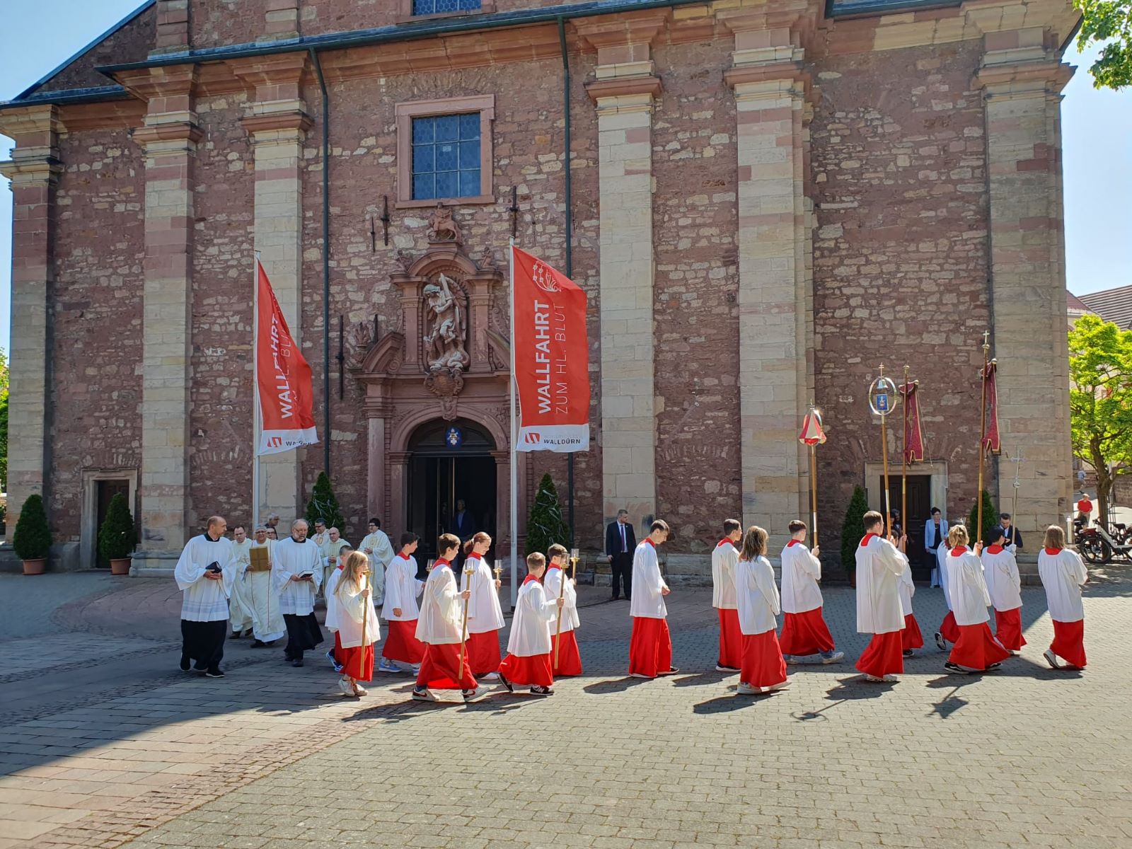 Am Samstag, den 03.06.2023 um 2:30 Uhr starteten von der Helmstadter Pfarrkirche 39 Pilger zur Fußwallfahrt zum Heiligen Blut nach Walldürn. Sehr erfreulich war, dass wir 7 neue Pilger bzw. Pilgerinnen begrüßen konnten. Nicht wenige von uns sind ja schon seit sehr vielen Jahren mit dabei. Um 11:30 Uhr wurde unsere Gruppe nach einem etwa 30 km langen Fußweg in Walldürn von Pater Josef Bregula und seinen Ministranten begrüßt und in die Wallfahrtsbasilika geleitet.