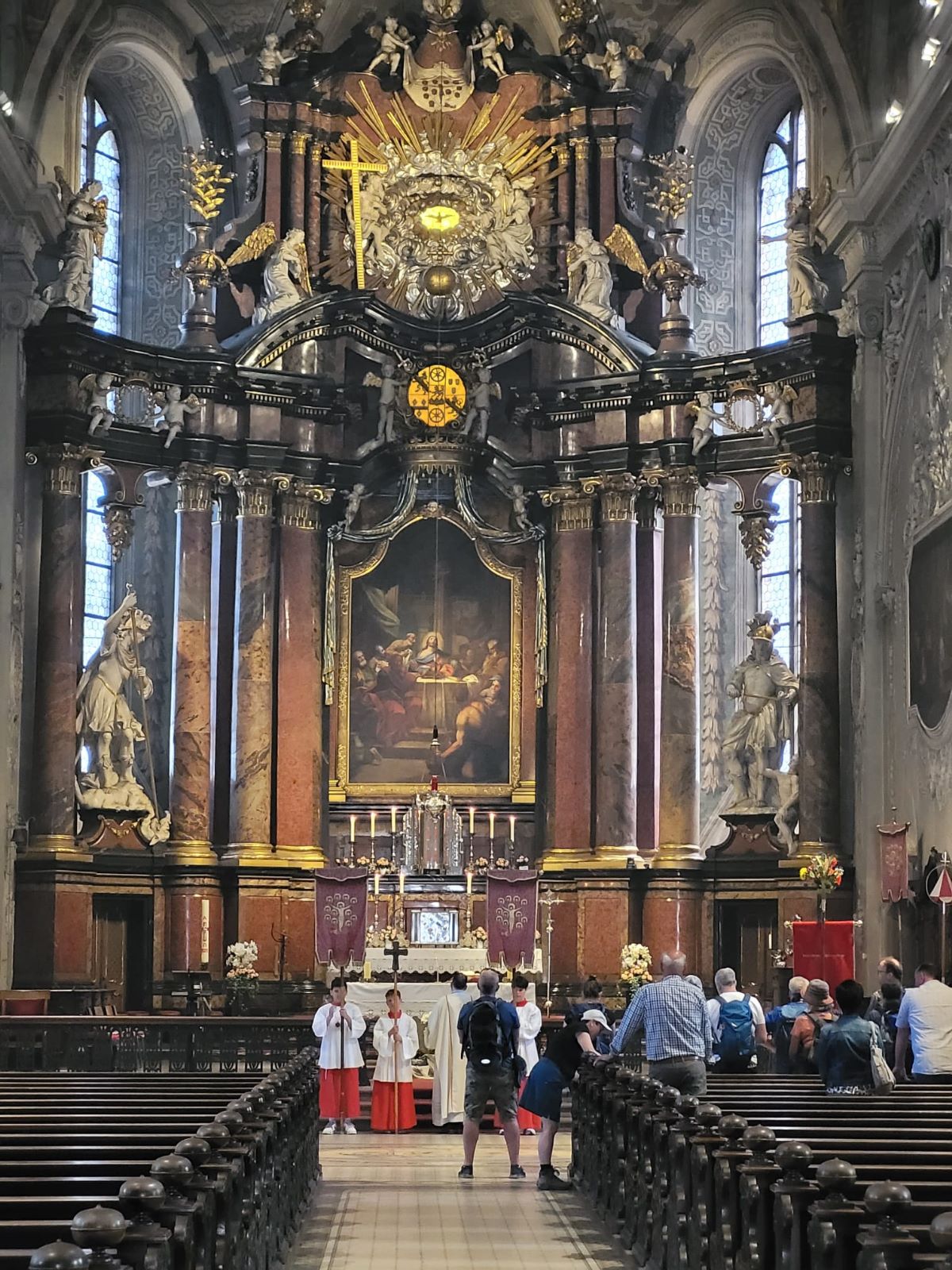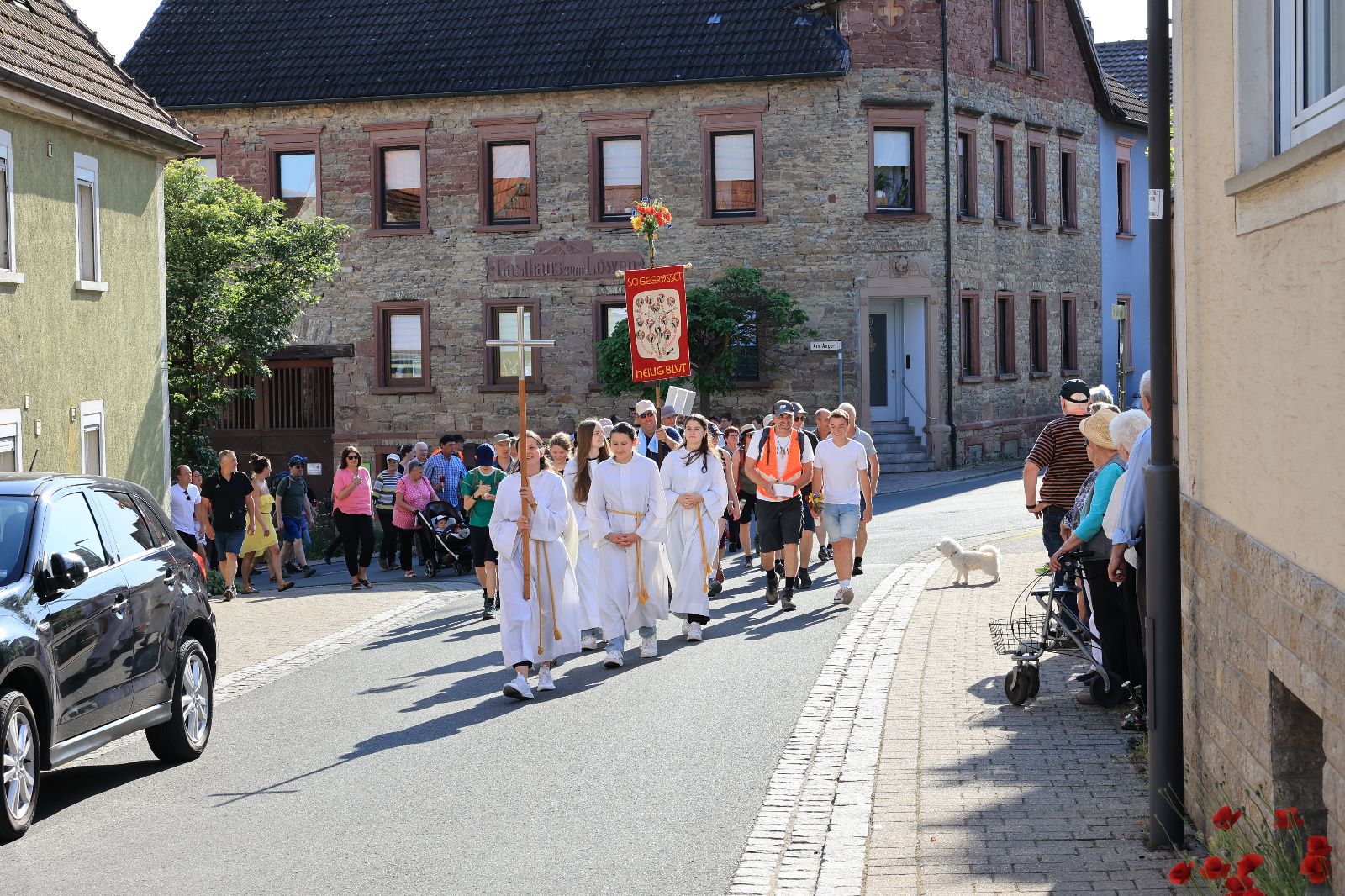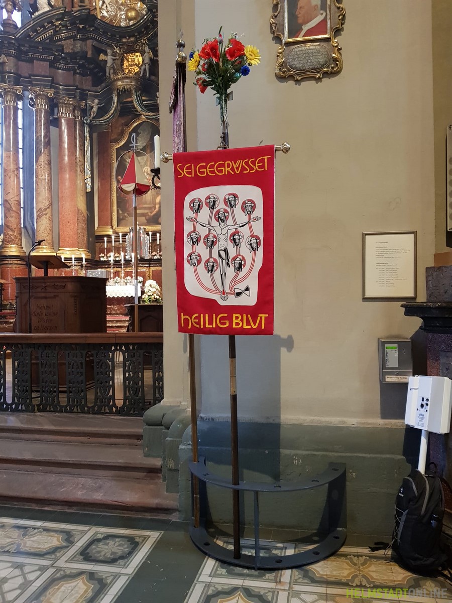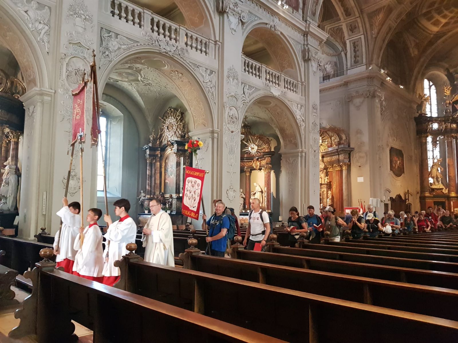 Am Samstag, den 03.06.2023 um 2:30 Uhr starteten von der Helmstadter Pfarrkirche 39 Pilger zur Fußwallfahrt zum Heiligen Blut nach Walldürn. Sehr erfreulich war, dass wir 7 neue Pilger bzw. Pilgerinnen begrüßen konnten. Nicht wenige von uns sind ja schon seit sehr vielen Jahren mit dabei. Um 11:30 Uhr wurde unsere Gruppe nach einem etwa 30 km langen Fußweg in Walldürn von Pater Josef Bregula und seinen Ministranten begrüßt und in die Wallfahrtsbasilika geleitet.