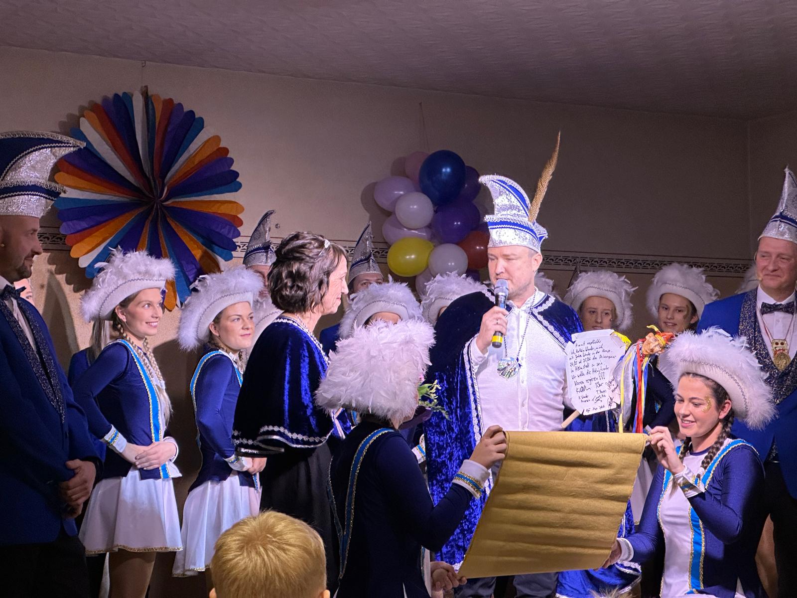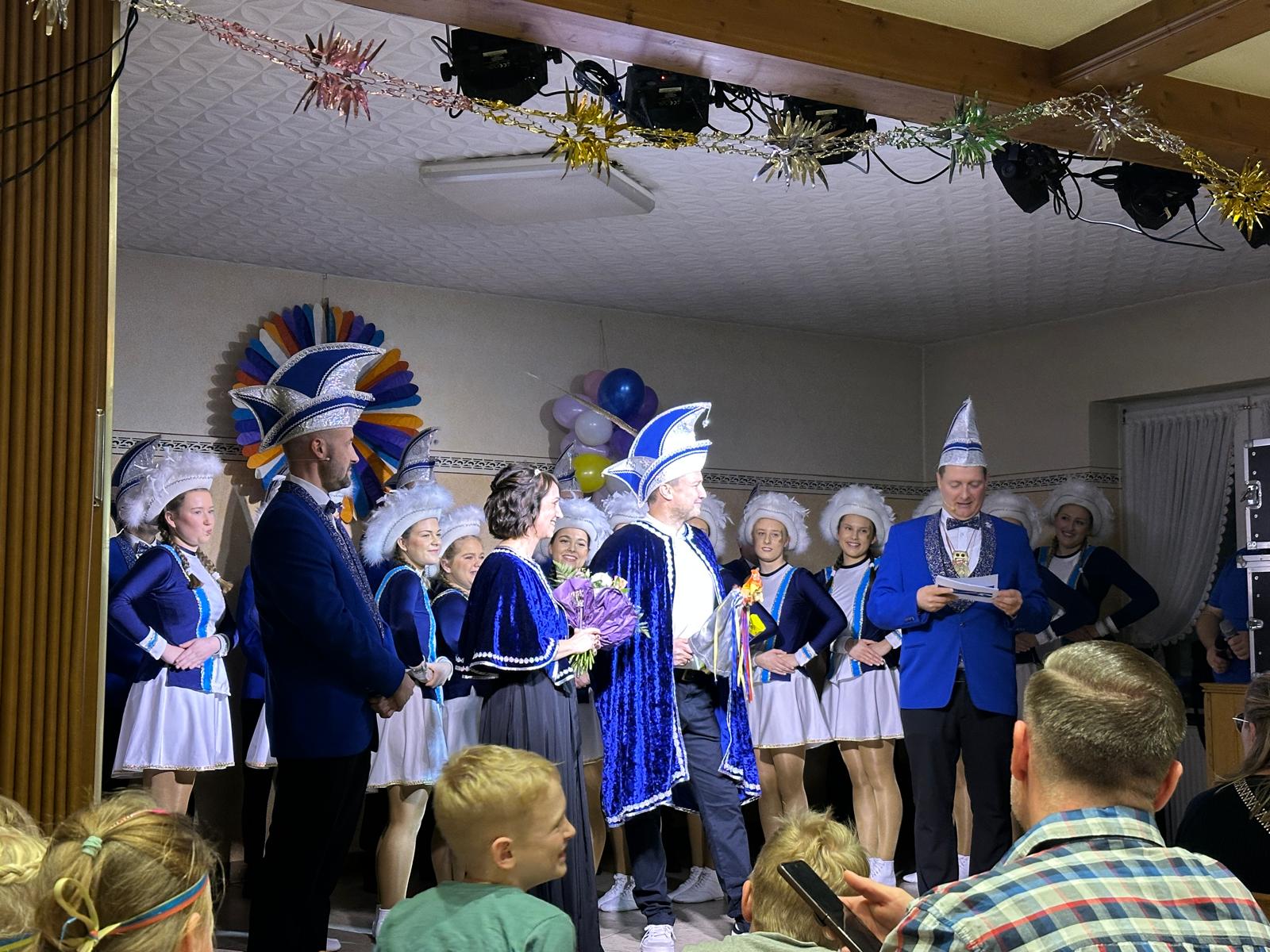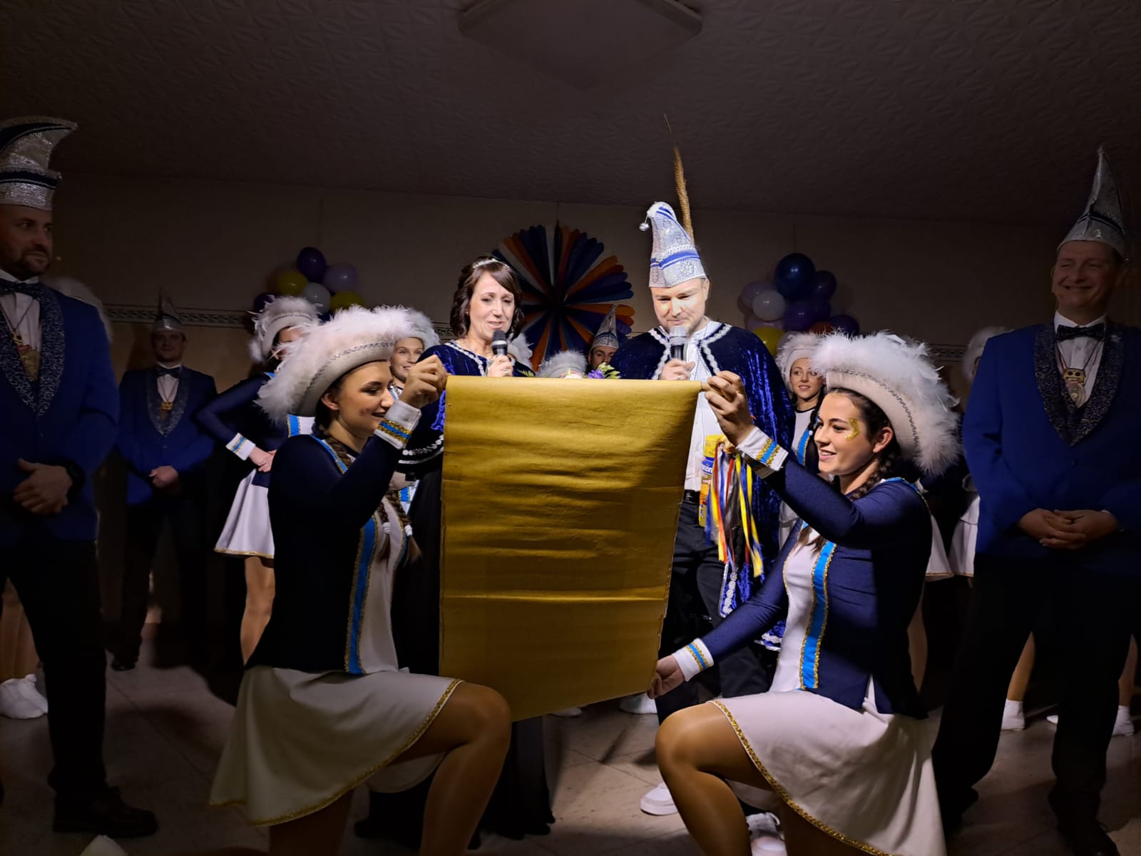 Nachdem der Faschingsclub Helmstadt am 11.11.2024 das Rathaus gestürmt und den Bürgermeister in Fesseln gelegt hatte, stand die Inthronisierung des neuen Prinzenpaares auf dem Programm. Sitzungspräsident Thomas Bauer stellte das neue Prinzenpaar für die Kampagne 2023/2024 vor. Prinz Jochen, der zweite, hoheitlicher Schatzmeister im benachbarten Gelbfuss-Land aus dem Hause Schöpper und seine Lieblichkeit, Prinzessin Kathrin, die zweite, Kugelschreiber-schwingende Bürofee im Haus der Neugeborenen, aus dem Lande der Zwieweltrater.