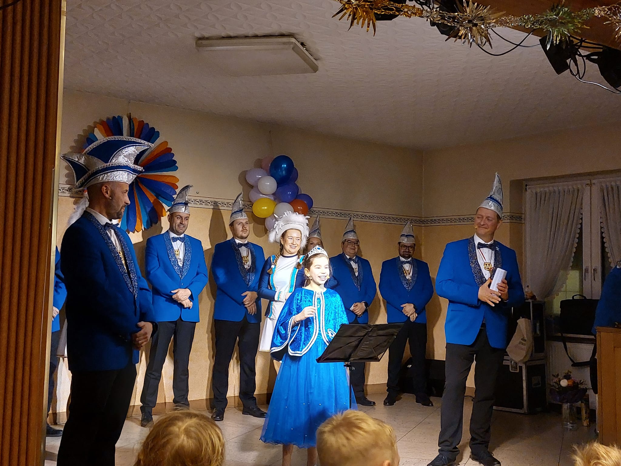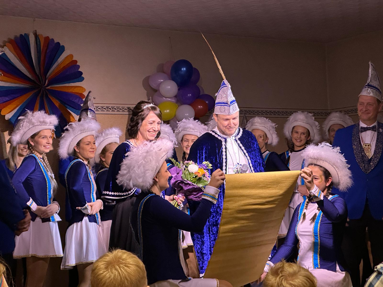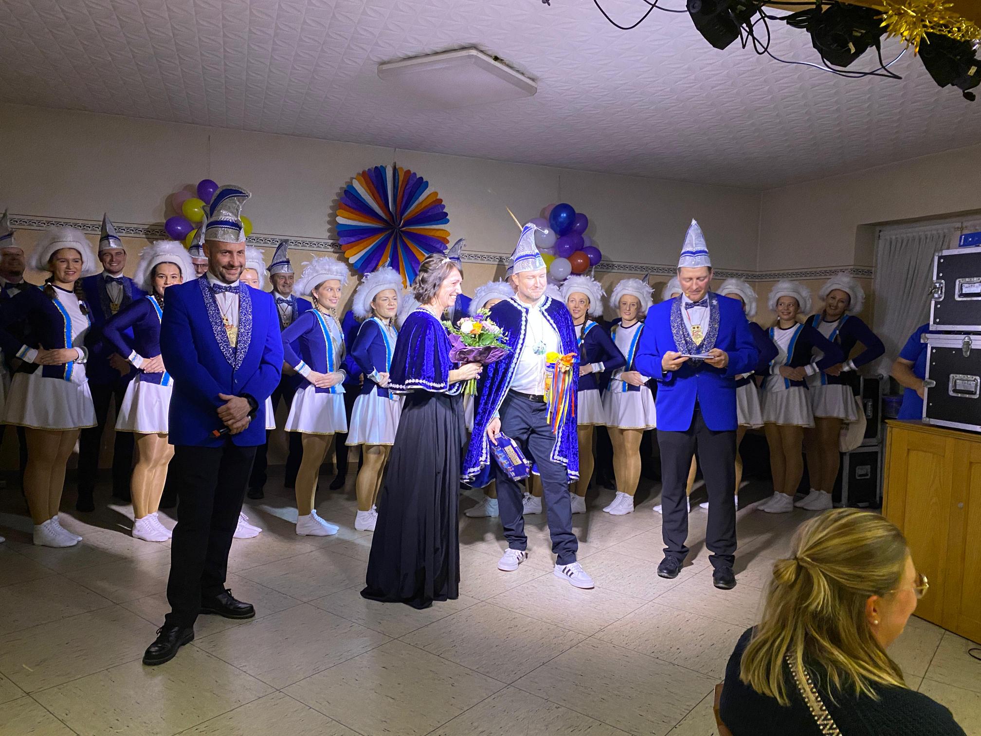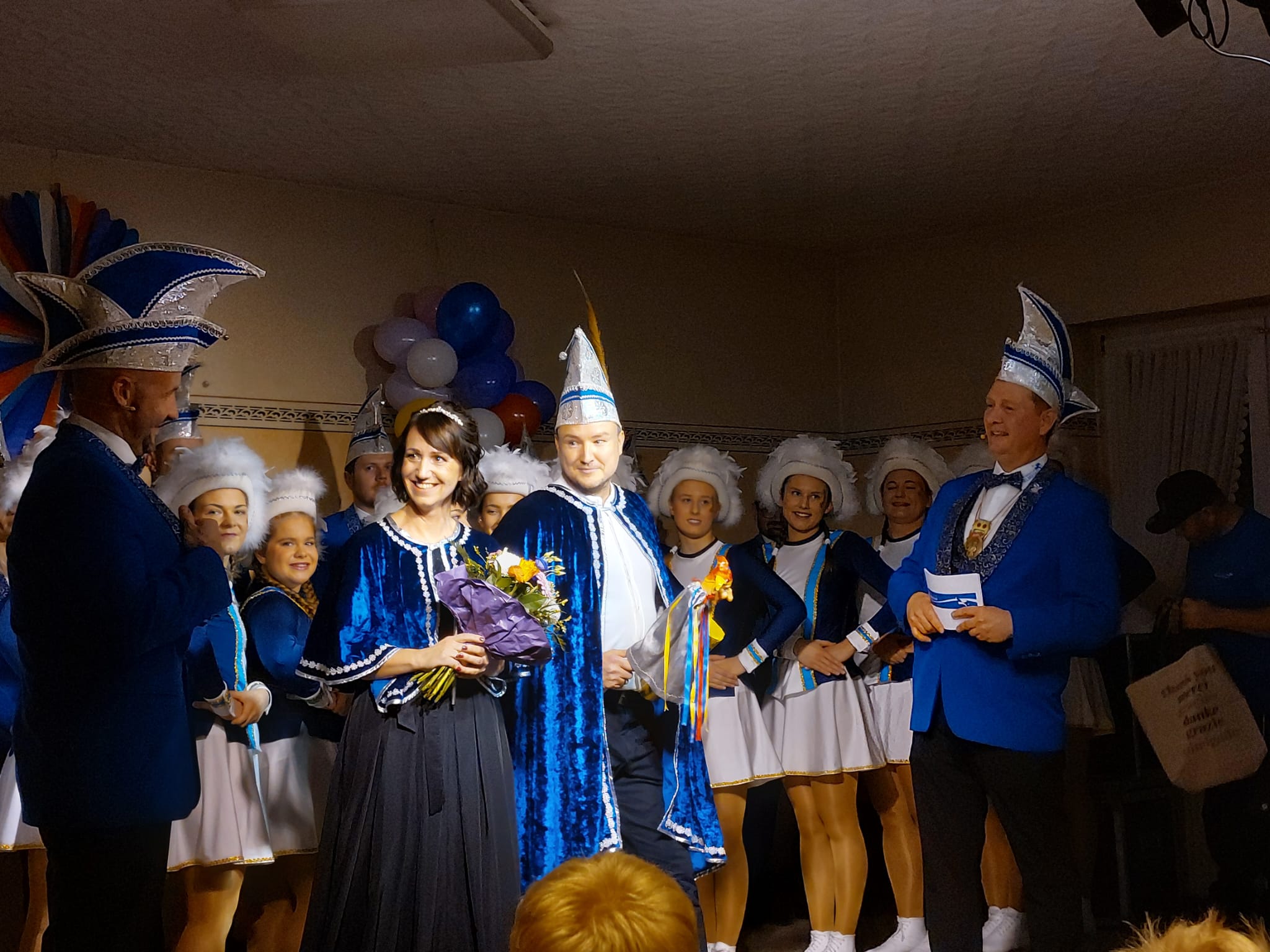 Nachdem der Faschingsclub Helmstadt am 11.11.2024 das Rathaus gestürmt und den Bürgermeister in Fesseln gelegt hatte, stand die Inthronisierung des neuen Prinzenpaares auf dem Programm. Sitzungspräsident Thomas Bauer stellte das neue Prinzenpaar für die Kampagne 2023/2024 vor. Prinz Jochen, der zweite, hoheitlicher Schatzmeister im benachbarten Gelbfuss-Land aus dem Hause Schöpper und seine Lieblichkeit, Prinzessin Kathrin, die zweite, Kugelschreiber-schwingende Bürofee im Haus der Neugeborenen, aus dem Lande der Zwieweltrater.