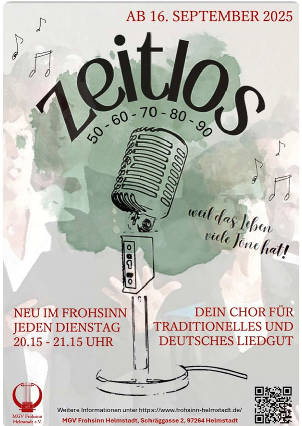 Ein Chor für den Mensch mit Lebenserfahrung, für alle Gelegenheiten, in guter Gesellschaft: Das „Zeitlos“, unser neues Chorprojekt im Haus Frohsinn. Wir verstehen uns als Gemeinschaft, die gerne singt, Zeit verbringt und miteinander ins Gespräch kommt, ein Zusammenschluss, der im Chor einer Leidenschaft nachgeht, die besonders mit zunehmendem Alter auch zunehmende Bedeutung erfahren kann. Besonders wichtig ist uns, die traditionellen und meist deutschen Lieder in Einklang mit einer modernen Gesellschaft zu bringen und dabei einen festen Stand in einer schnellen Welt zu haben, die aber auch Möglichkeiten des Auftretens für uns ermöglicht, um zu zeigen, dass es keine Grenzen gibt, wenn Menschen gemeinsam die Stimme erheben.