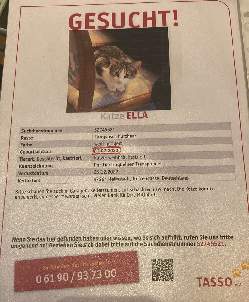 | Ella ist 5 Monate alt, Weiß-getiegert und am 25.12. nicht mehr von ihrem Rundgang in Helmstadt zurückgekommen. Sie ist tätowiert, gechipt und bei Tasso registriert. Wir vermuten, dass sie sich in einer Garage (o.ä.) rund um die Herrngasse versteckt hat und evtl. eingesperrt ist, da sie noch nie länger als 10 Minuten vom Haus weg war. Nachdem sie noch nicht jagen kann, dürfte sie auch recht ausgehungert sein. Wir freuen uns über geglichen Hinweis, wo die kleine Maus sein könnte. |