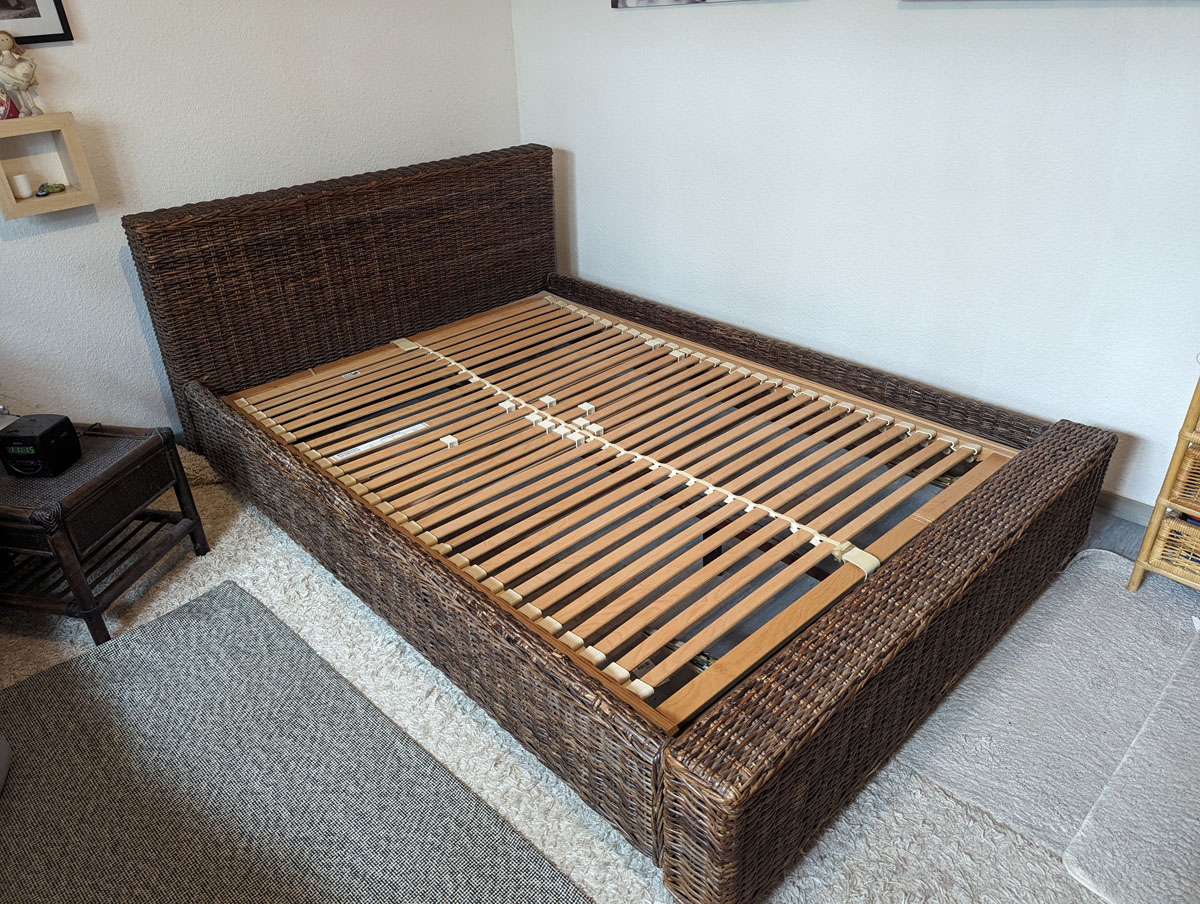| Rattanbett mit Lattenrost ohne Matratze, 1,40,× 2,00m zu verschenken | |