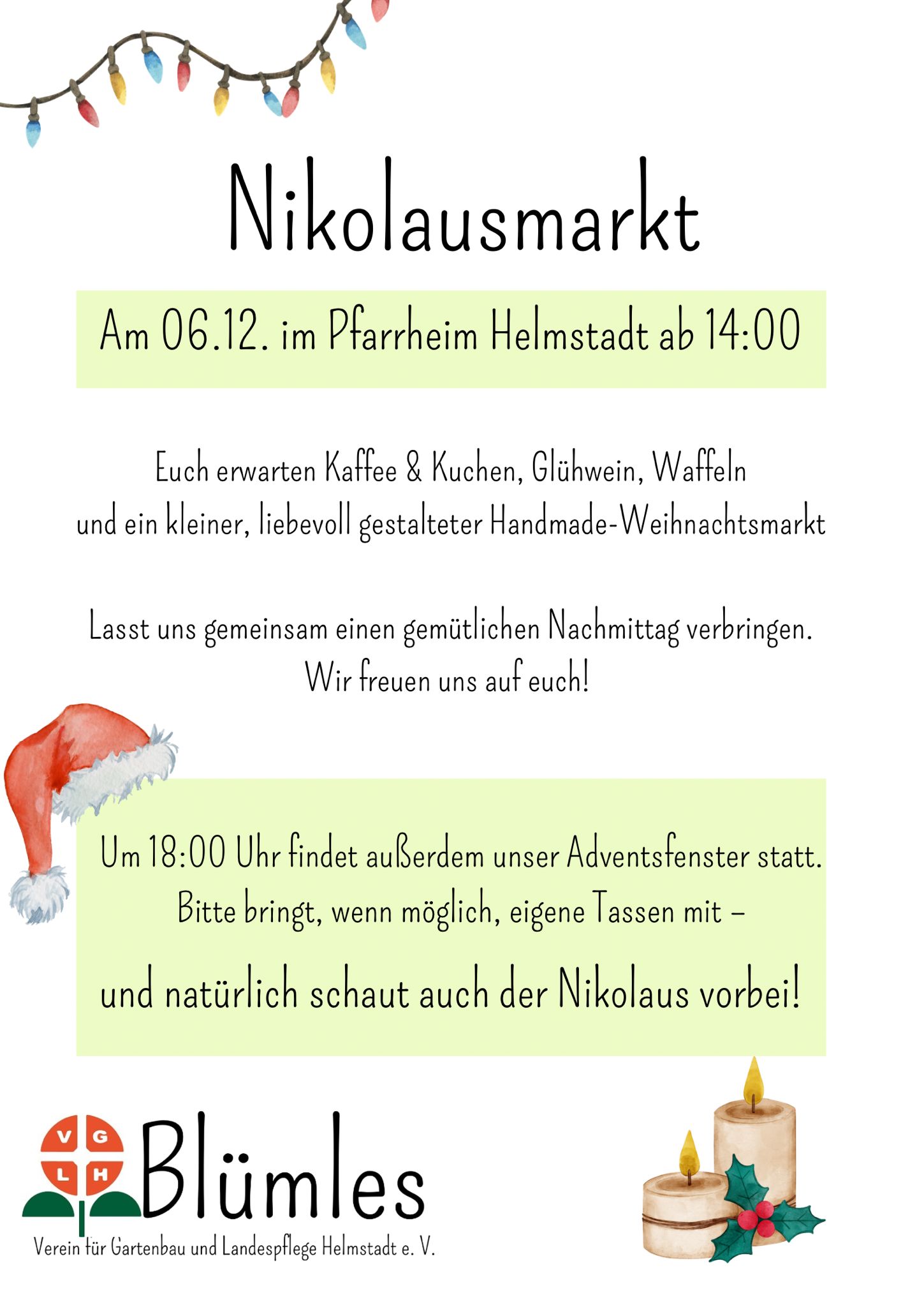 AM Samstag, 06.12.2025 erwartet Euch im Helmstadter Pfarrheim/Pfarrhof ab 14 Uhr Kaffee & Kuchen, Glühwein, Kinderpunsch, Waffeln ... und ein kleiner, liebevoll gestalteter HANDMADE-Nikolausmarkt